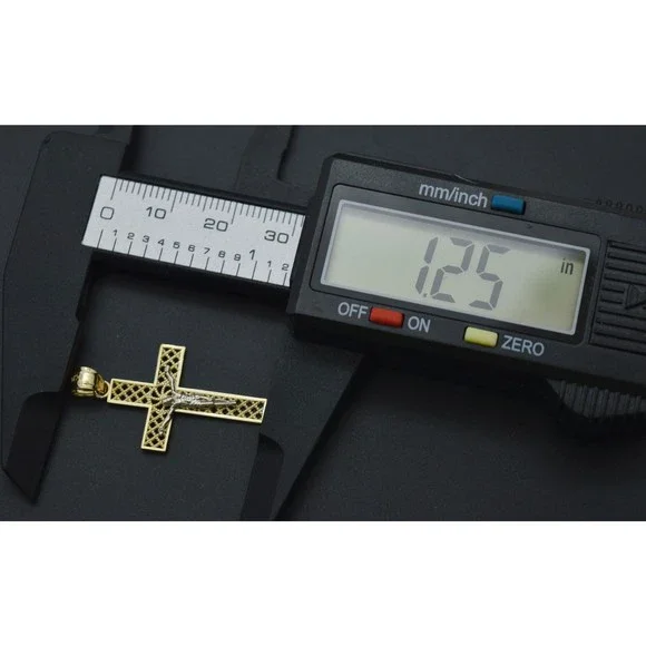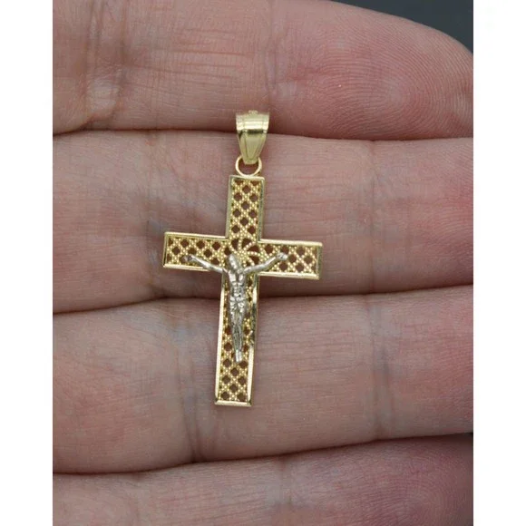 Capture the beauty of faith with our Real Solid 10K Yellow White Gold Shiny Jesus Cross Diamond Cut Pendant. Featuring exquisite diamond cutting, the shimmering pendant radiates elegance and class, making it a perfect addition to your jewelry collection. The solid 10K gold ensures longevity and durability for years to come. What better way to show your connection to a higher power? Own this breathtaking pendant and make a statement today!Specifications:Metal: Real 10K Yellow White Gold (Stamped, 10K)Condition: Brand NewPolished: ShinyWeight: 1.3 gramsHeight: 1.25 inches