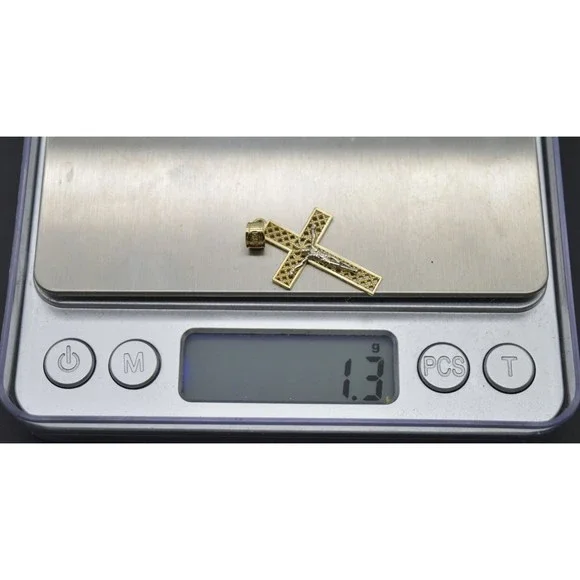 Real Solid 10K Yellow White Gold Shiny Jesus Cross Diamond Cut Pendant 1.3gr