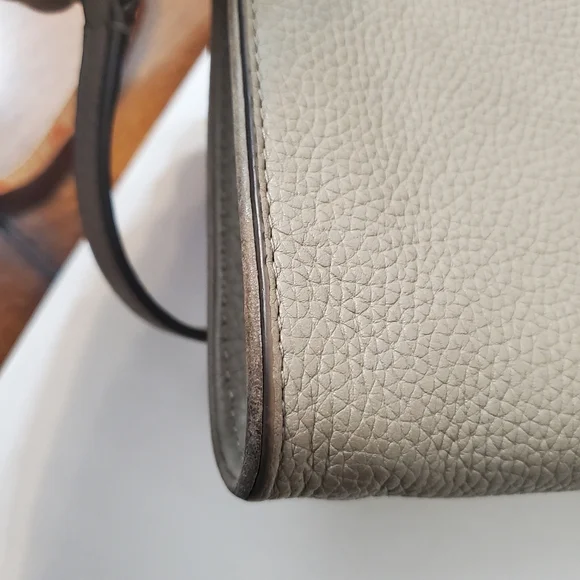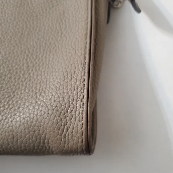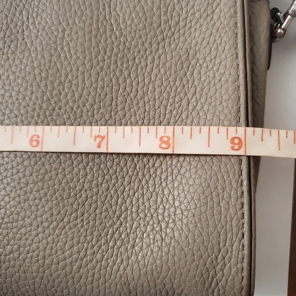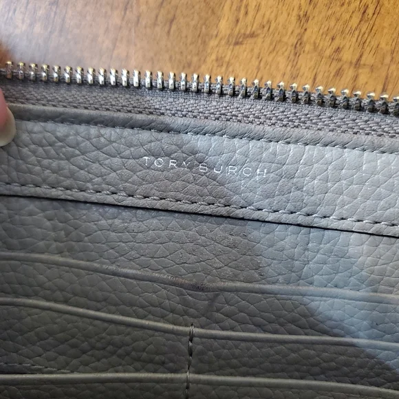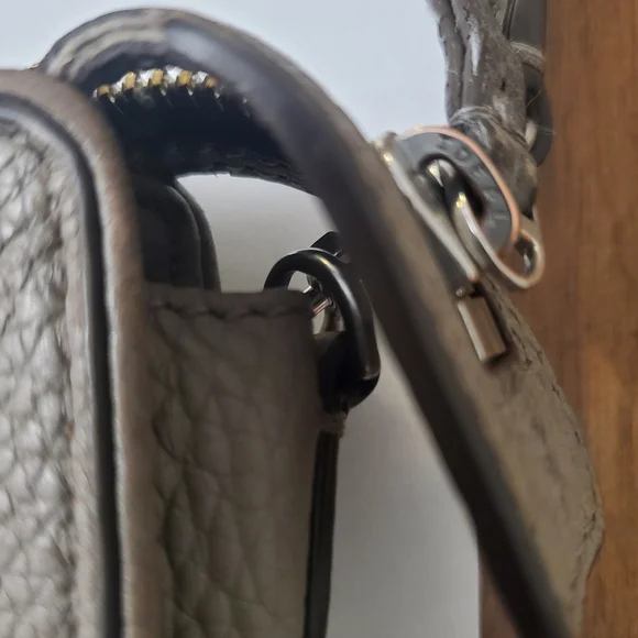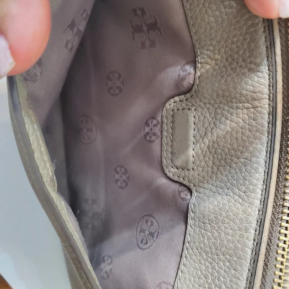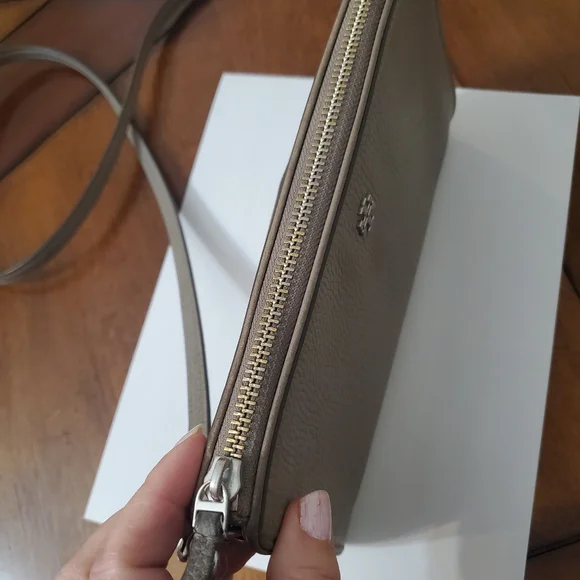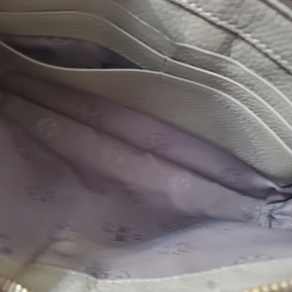Stylish gray leather crossbody bag by Tory Burch. Features a sleek design with a subtle logo detail.uesd see the photos
