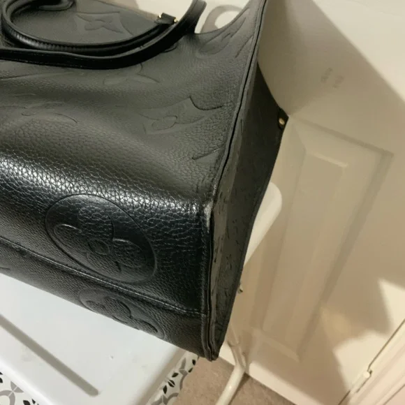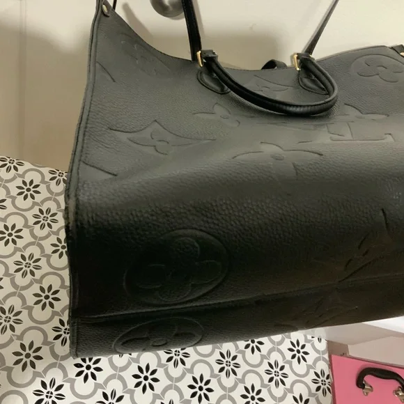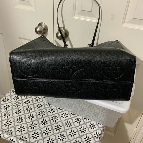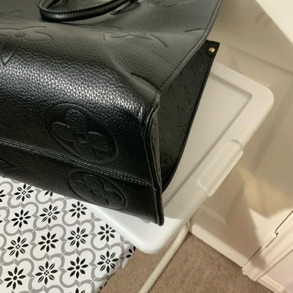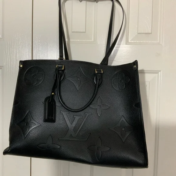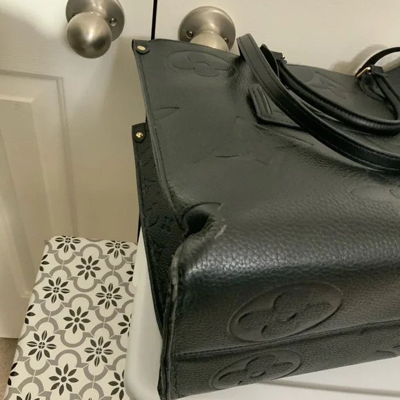 Experience timeless elegance with the Black Vegan Leather. The tote is in very good condition with minor scrapes on the outer edges of the bag. The spacious bag features a sophisticated monogram design and a structured silhouette, perfect for both work and everyday use.