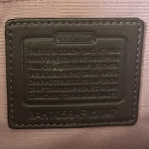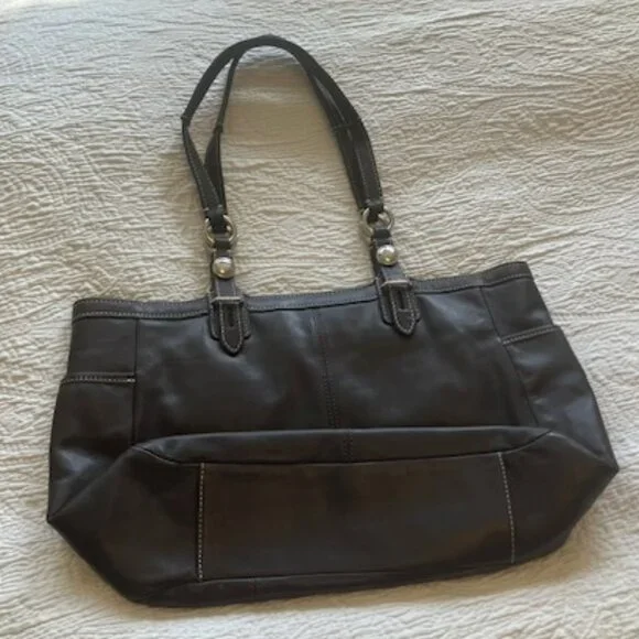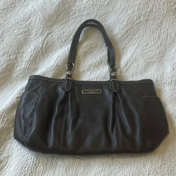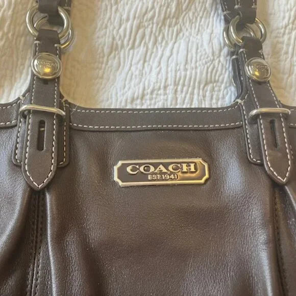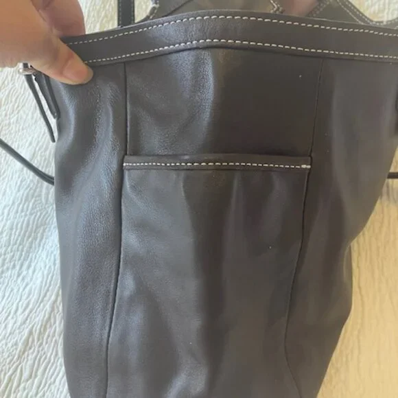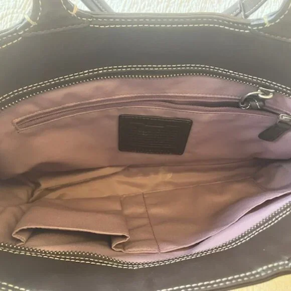 Beautiful Soft Brown Leather Coach Purse. Silver Hardware. Cream Colored Stitching Throughout. Pockets on Both Sides. Lilac Interiors. Long Zippered Pocket on One Side and Two Open Pockets on the Other Side. Measures 16-1/2" wide x 9" long x 5" deep, 8.75" strap. Silver Coach Logo on Front. Great for Everyday Use or for Work.