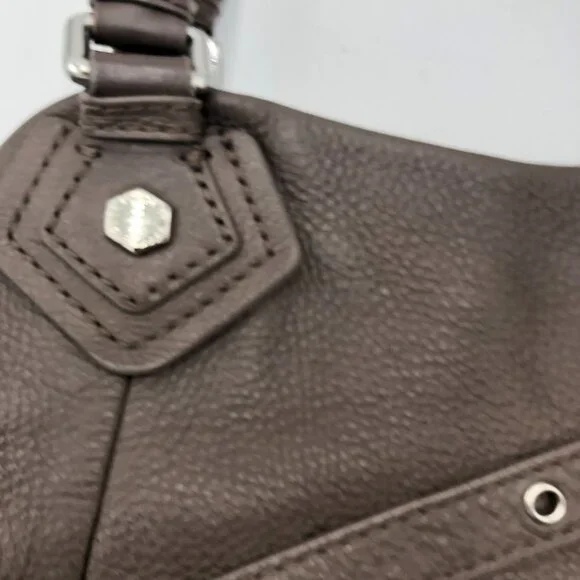 The buttery-soft pebbled leather bag had both double handles and a crossbody strap. The roomy inside features an open and zippered pocket and two fobs. Graphic logo lining....