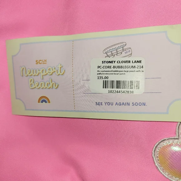 new with price tag.. no brand tag. stoney clover lane.patches custom sewn by scl on large bubblegum pouch