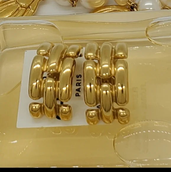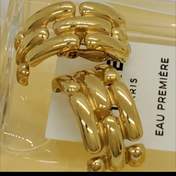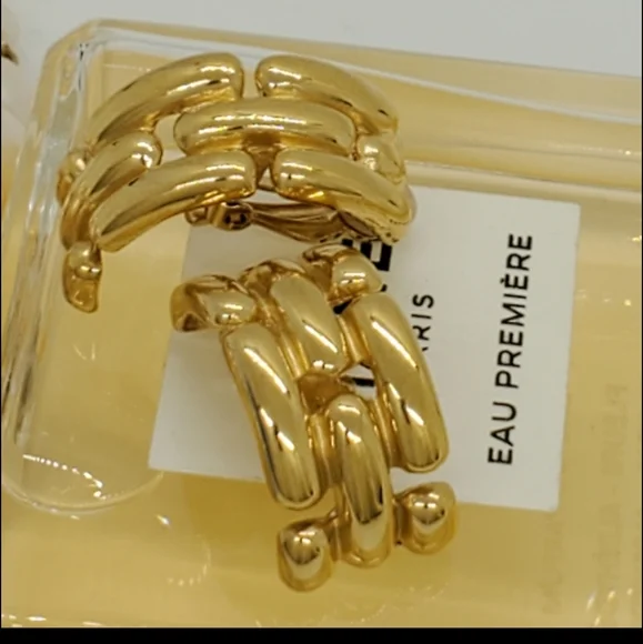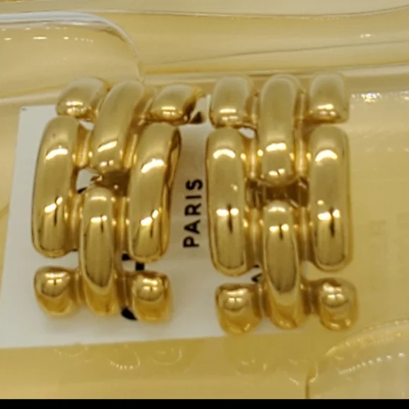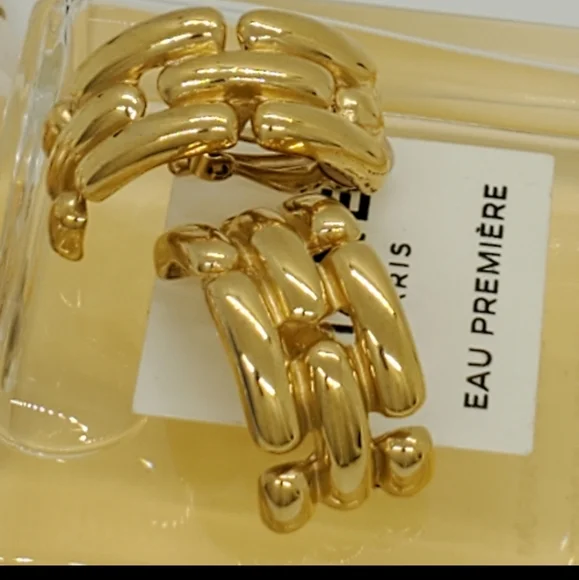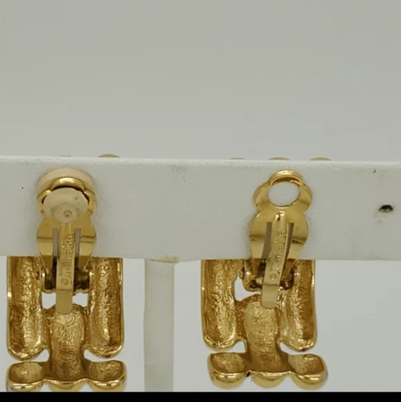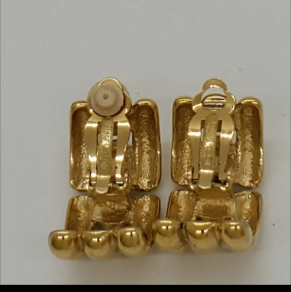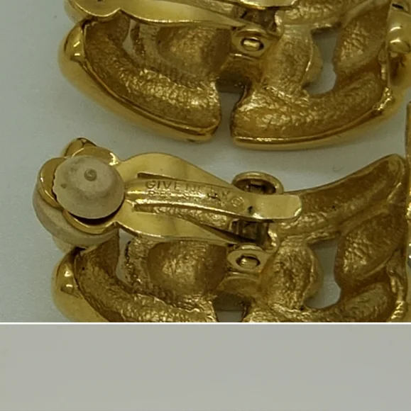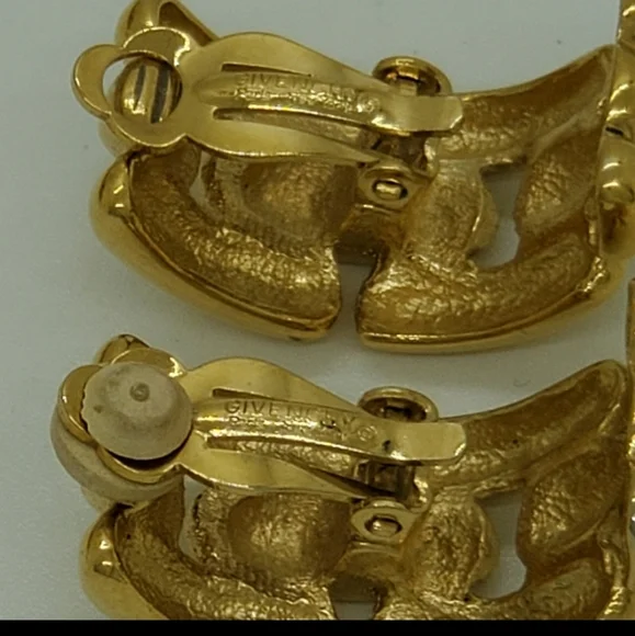 Vintage authentic Givenchy earrings have a secure clip on. The signature states Givenchy Paris New York.There is missing cushion. The gold plated designer earrings are in good vintage condition.The metal content is unmarked and of good quality.Measurements are approximately 1 1/4 inches.