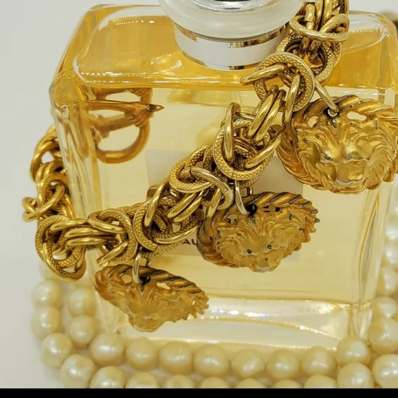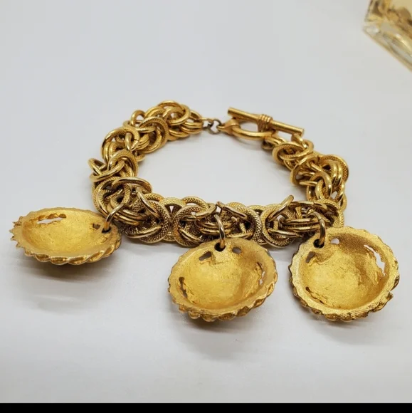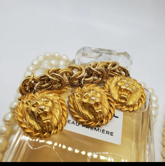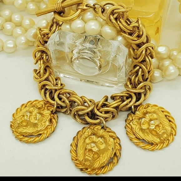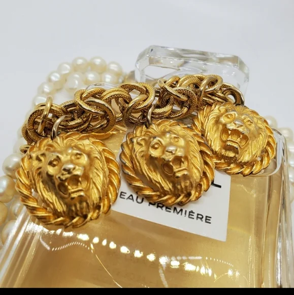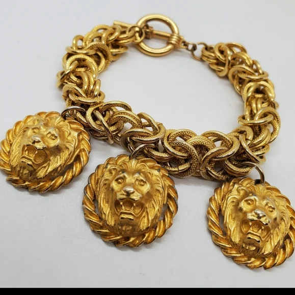 Gorgeous vintage authentic Anne Klein lion charm bracelet with a toggle closure.The designer bracelet has vintage wear. The metal content is unmarked, and the Anne Klein bracelet is unsigned. This is from the approximate 70´s era. The design is chunkyand solid. Vintage designer lion jewelry is quite the fashion trend. Measurements are approximately 8 inches.