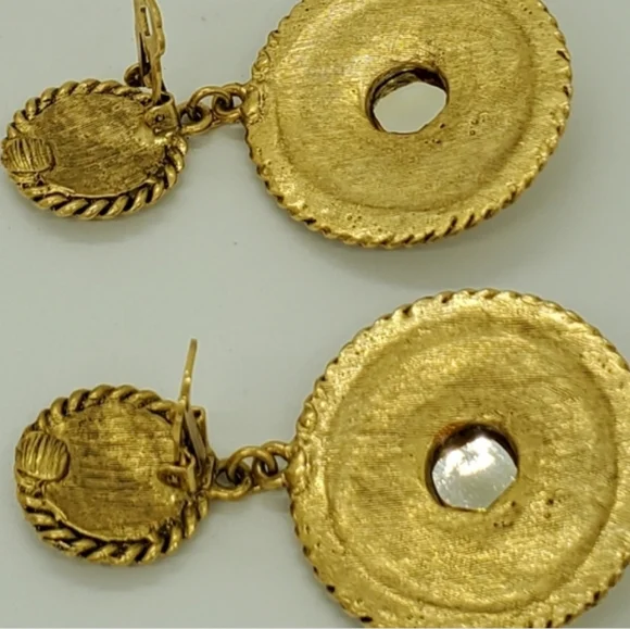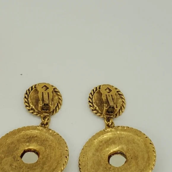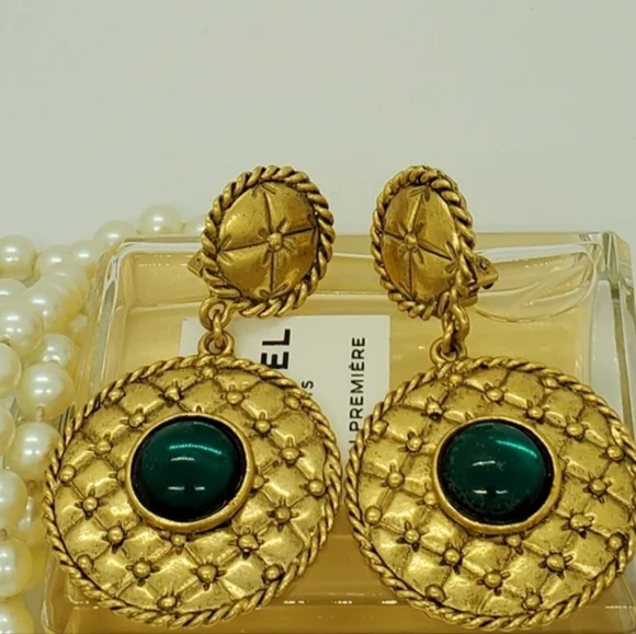 Wow!Get ready for the fashion show in Paris, New York, London, France, or Milan with these gorgeous vintage rare door knocker quilted unbranded detailed absolutely stunning statement earrings.There is a secure clip on. The green simulated stones are gorgeous.The high quality earrings are unmarked for metal content or designer.These earrings would rival the very best vintage jewelry designers.The runway worthy earrings are in good vintage condition with minor wear consistent with age.Beautiful earrings!Measurements are approximately 3 x 1.5 inches.