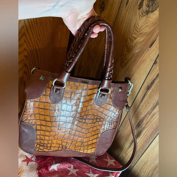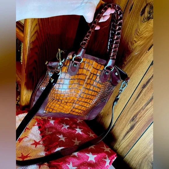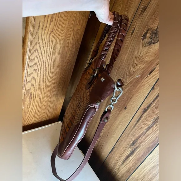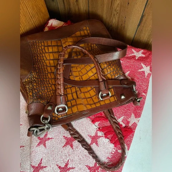 Falor Italian Leather Tote / Messenger Bag; Croc Embossed Leather Body; Brown Leather Trim; Braided Leather Permanently Attached Handles; Aged Silver Hardware; Pyramid Shaped...