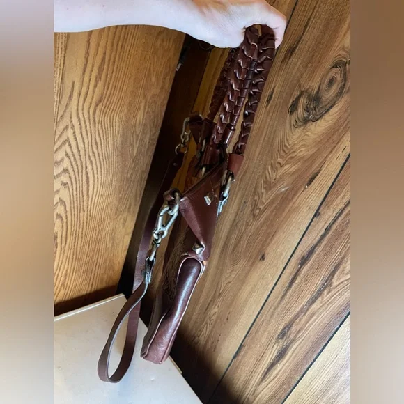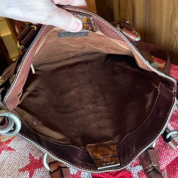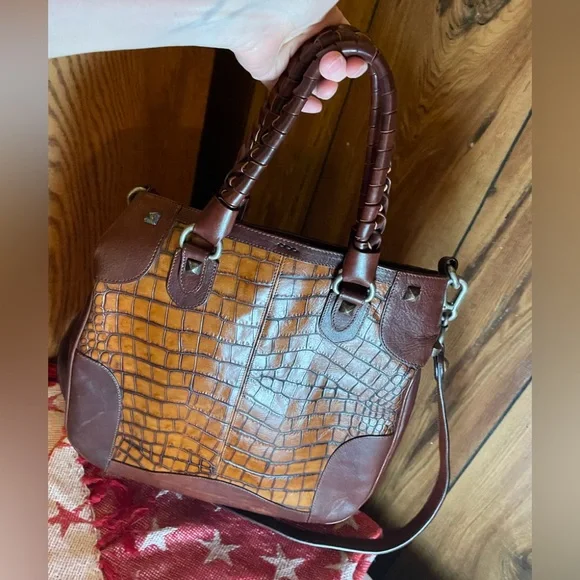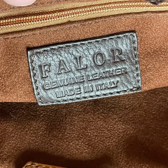 Falor Italian Leather Tote / Messenger Bag; Croc Embossed Leather Body; Brown Leather Trim; Braided Leather Permanently Attached Handles; Aged Silver Hardware; Pyramid Shaped Rivets Reinforce Trim For Straps & Handles; Gorgeous Chestnut Brown Suede-Look Velvet Lining ; Zipper Pocket; Falor’s Leather Designer Patch; Magnetic Snap Top Closure; Pressure Hook On/Off Crossbody Strap; Handles Can Be Worn On The Arm; A Few Exterior Trim Scratches; Small Strap Scratch; Gorgeous Bag; GUC