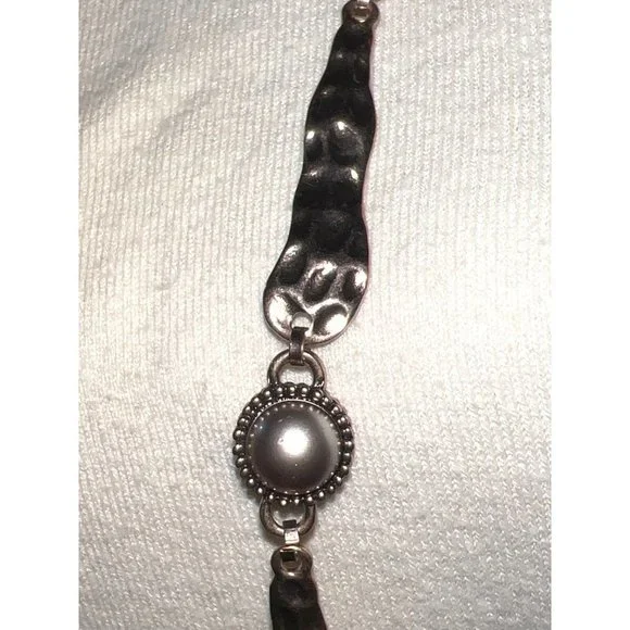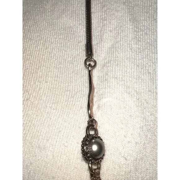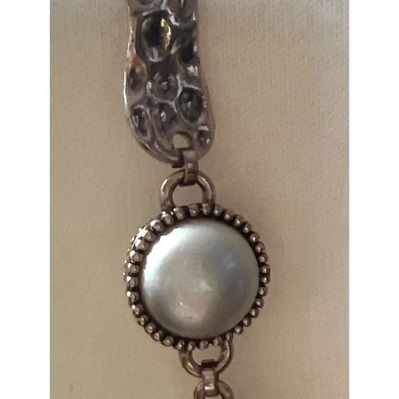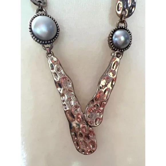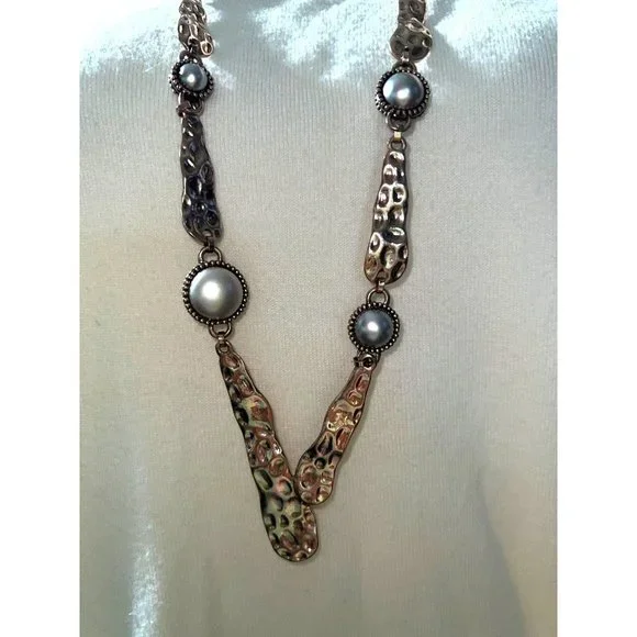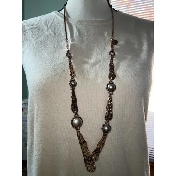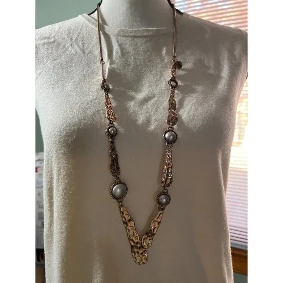 This beautiful organic style necklace is from the Spanish fashion jewelry designer, Adolfo Dominguez. Necklace is in rose gold-tone hammered metal with champagne tone fashion pearls. Approximately 36” in length.