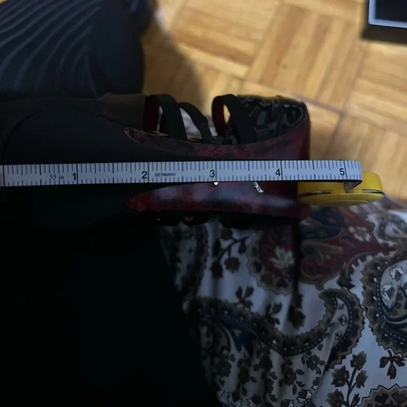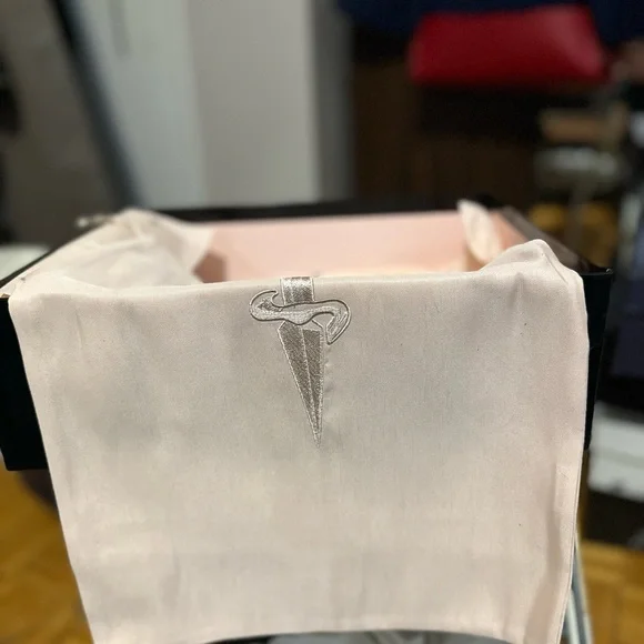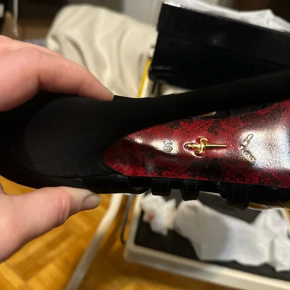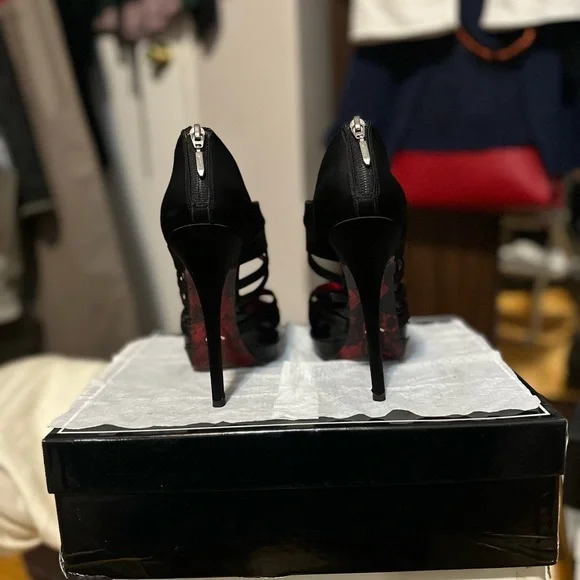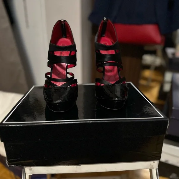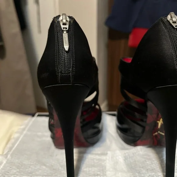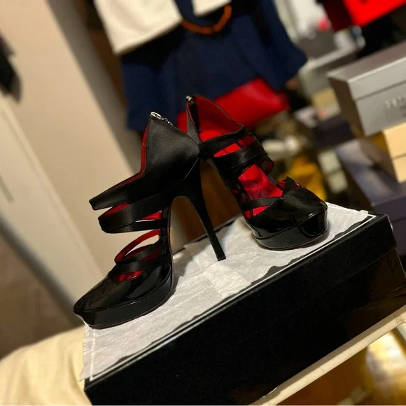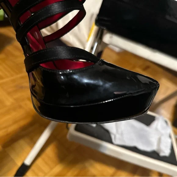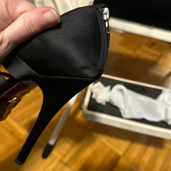 Authentic Cesare Paciotti Fall/Winter Black satin and patent leather strappy pumps Monogrammed back zipper closure Size 38, like US 7 Worn 1x in almost perfect condition Slight...