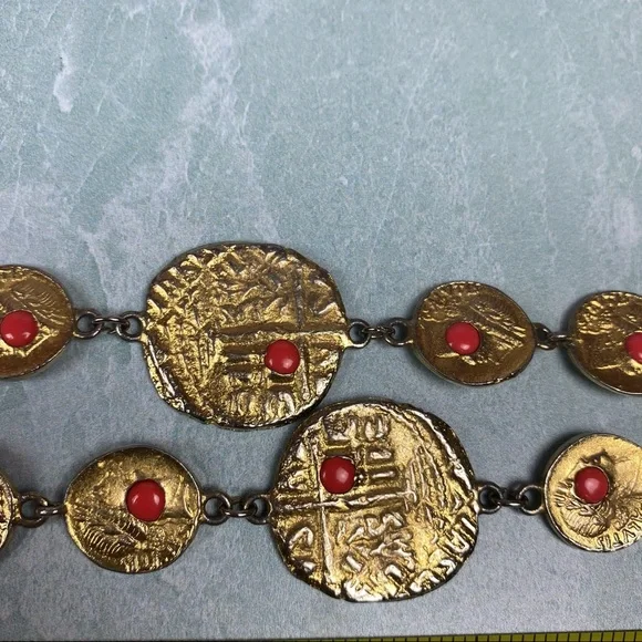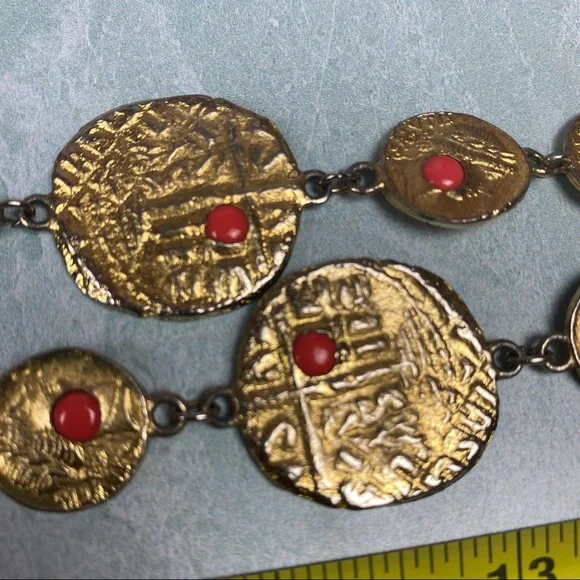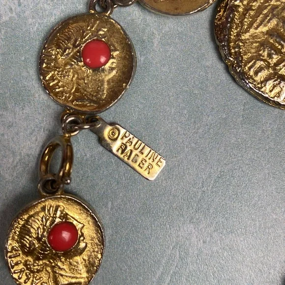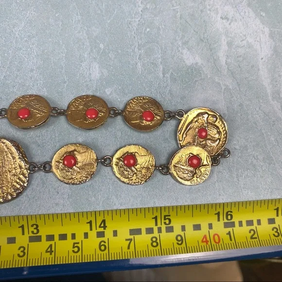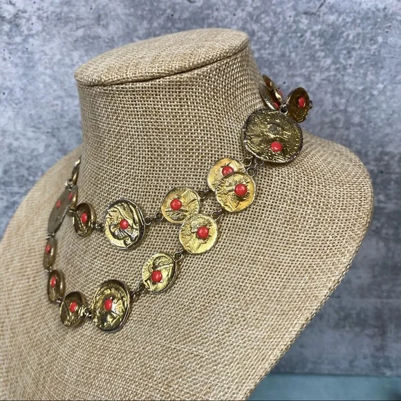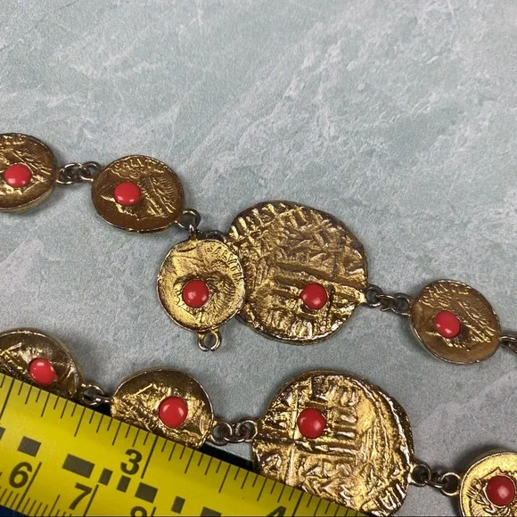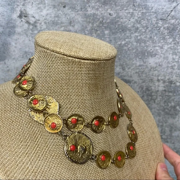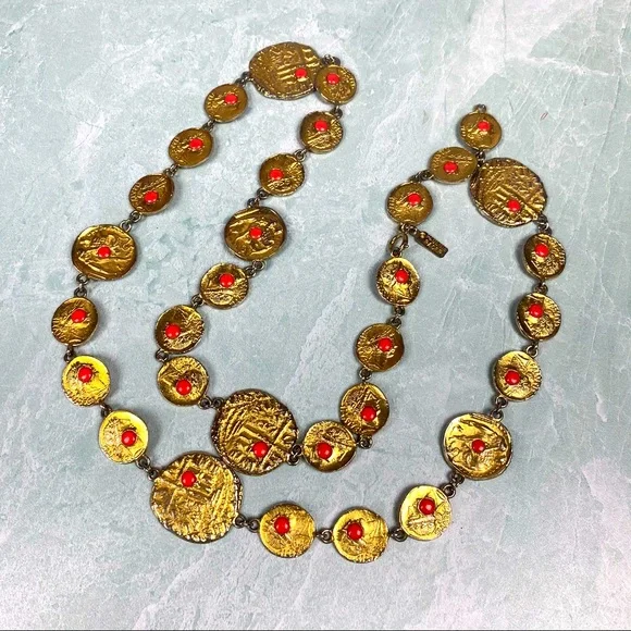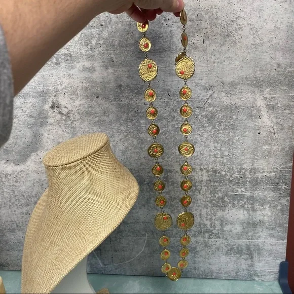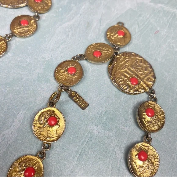 Rare Pauline Rader necklace Long gold coin necklace Roman coin. Mothers day gift. Coral orange stones. 32 inches. 1980’s. Mid century