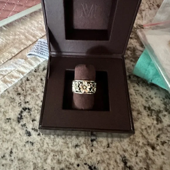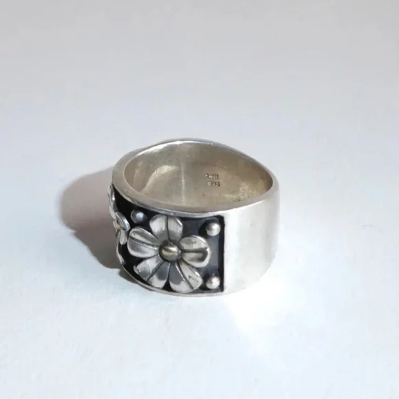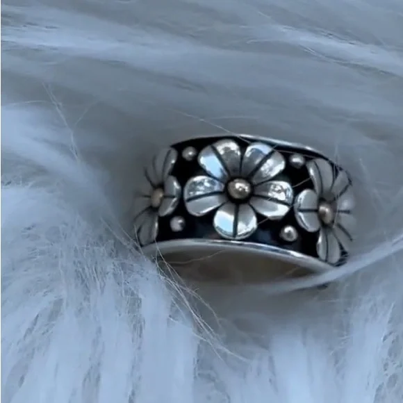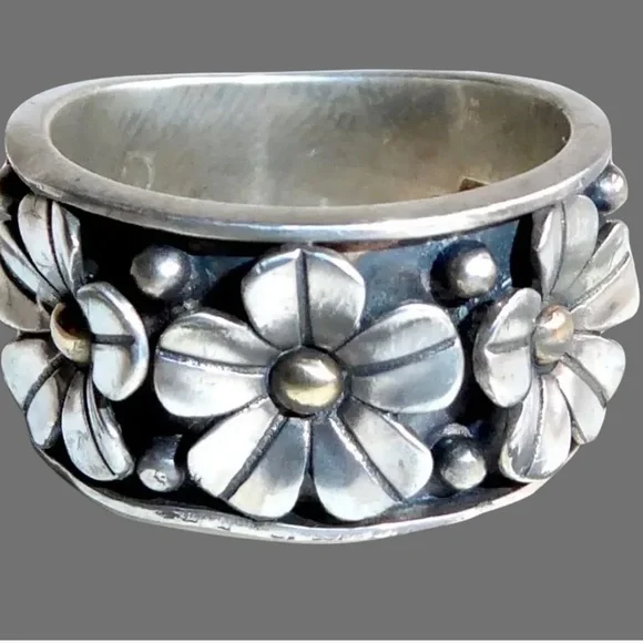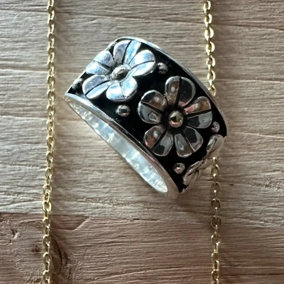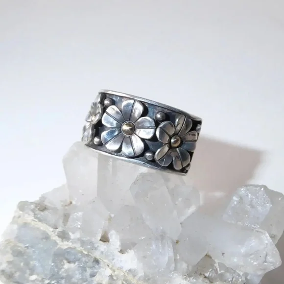 Elegant Solid Sterling Silver With Solid 14k Yellow Gold Accents featuring a beautiful floral design with oxidized background. Perfect for adding a touch of sophistication and timeless style to any outfit.Vintage Estate Solid Sterling Silver Solid 14k yellow gold accents- will not fade off Weight- 7 Grams Excellent Awesome Heirloom Quality Size 7 Perfect New Condition Solid Heavy Weight- last forever Floral Daisy FlowersOxidized Background Gorgeous Timeless Style Perfect To Wear With Mixed Metals - Yellow Gold Sterling Silver Rose Golds Other listings include American Vintage Estate Artisan Sundance Free people we the free Anthropologie Pilcro Levi’s wrangler Lee riders mother denim polo Ralph Lauren Pandora Tiffany & co Le Vian Zales Van Cleef & Arpels Kate spade Coach Michael Kors Monica Vinader Monica rich Kosann awe inspired lucky brand fossil 12k 14k 18k yellow white solid gold genuine gemstone emerald Ruby diamond sapphire opal boho coastal cowgirl lane frye spell & the Gypsy collective Tory Burch birthday anniversary wedding event best friend sister mother grandmother daughter pearl shabby chic Navajo Zuni turquoise