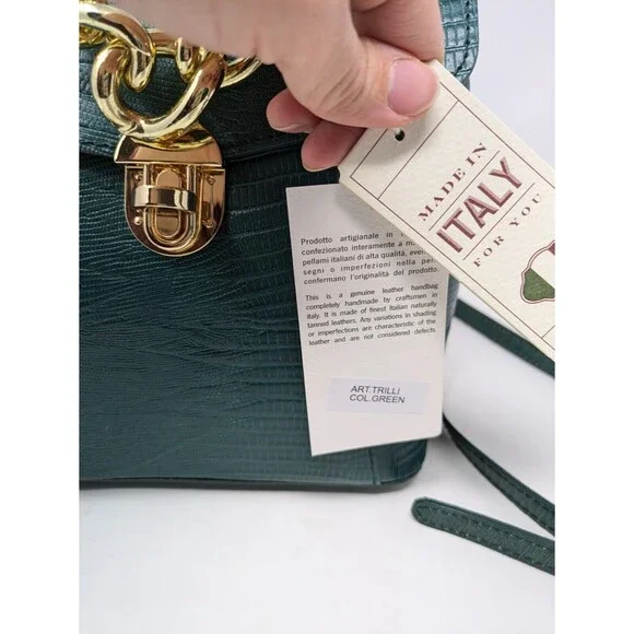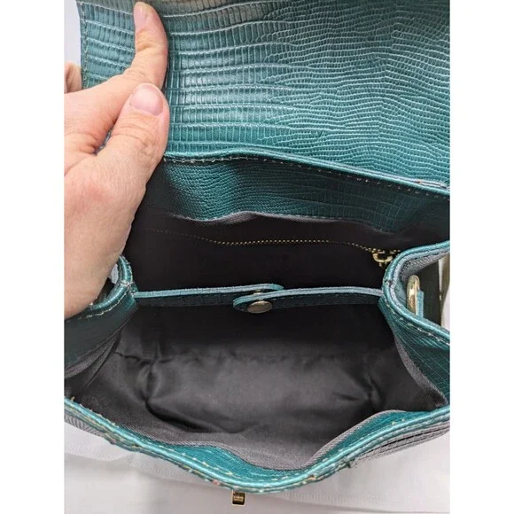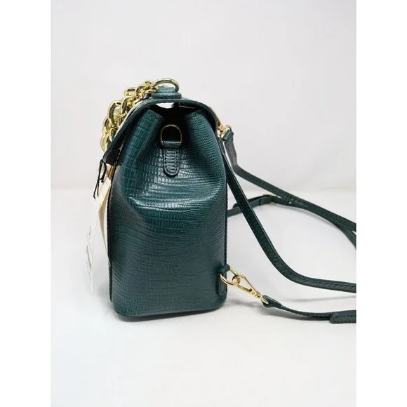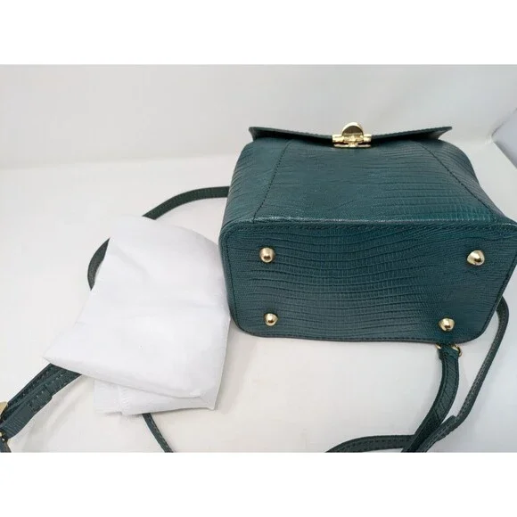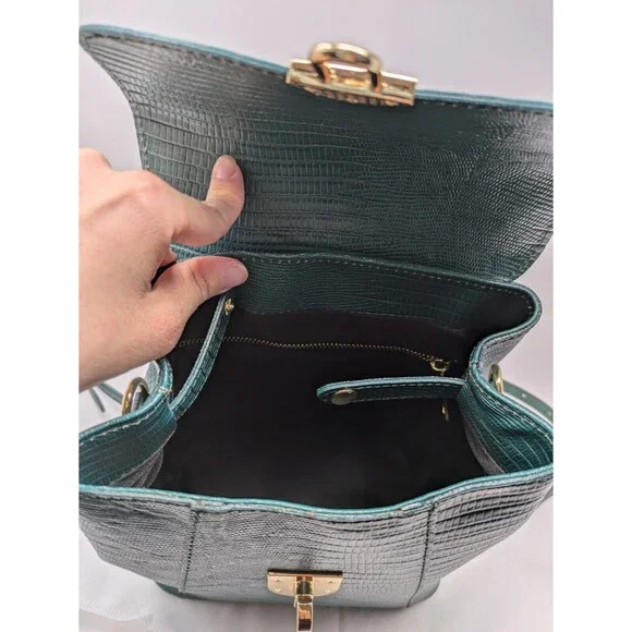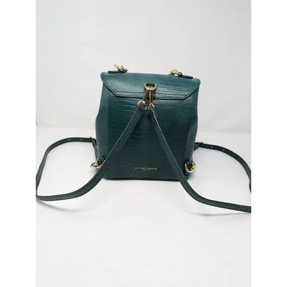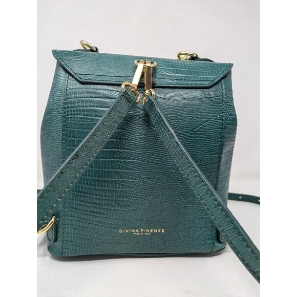 Divina Firenze Trilli Leather Convertible Backpack/Crossbody BagMade in ItalyColor: GreenNew With tagsFeatures:* Croc embossed leather outer* Lined interior - nylon* Handmade in Italy* Gold tone hardware* Two removable, adjustable shoulder/crossbody straps included* Versatile ways to wear - backpack, hand bag, crossbody bag* Handle drop 3* Main body has flap with flip-lock fastener* One internal zippered pocket* 4 protective feet on bottom* Dust bag includedApproximate measurements: 8.5 W X 8.5 H 5"