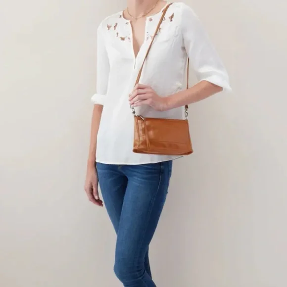 New without tags HOBO Cadence Convertible Crossbody In TruffleDesigned for minimalists and made to hold just the necessities, HOBO´s Cadence is a leather crossbody purse made with a convertible strap, allowing it to be a crossbody bag or long shoulder bag.• 9 ¼"W x 5"H x 2 ½"D. (Interior capacity: small.)• 7 ¼" strap drop; 19" shoulder strap drop; 26 ¾" crossbody strap dropGlazed, lightly textured leather composes the clean curves of a sized-down crossbody bag that serves as a versatile around-town staple.• Top zip closure• Optional, adjustable crossbody strap• Exterior slip pockets• Interior zip and wall pockets; three card slots