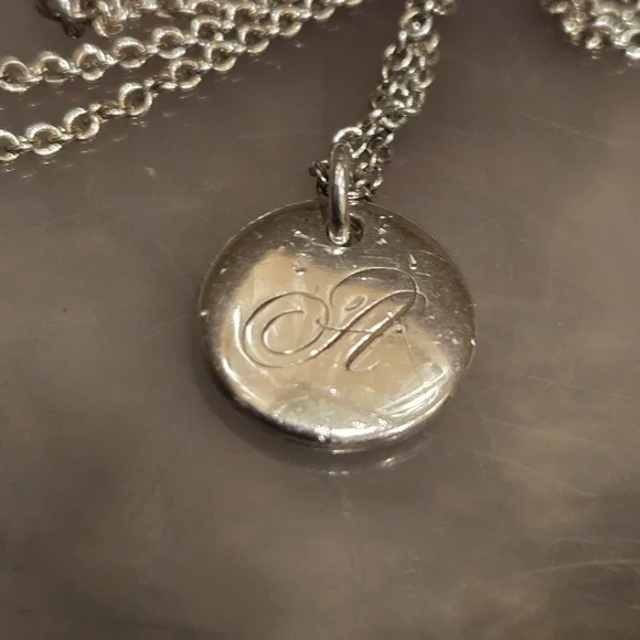This elegant Tiffany & Co necklace is part of the Alphabet Notes collection. The disc charm is inscribed with the letter A written script. It comes on an 18-inch chain and is not removable.Charm measures Size a half inch in diameter.Take a look at my other listings ❤️