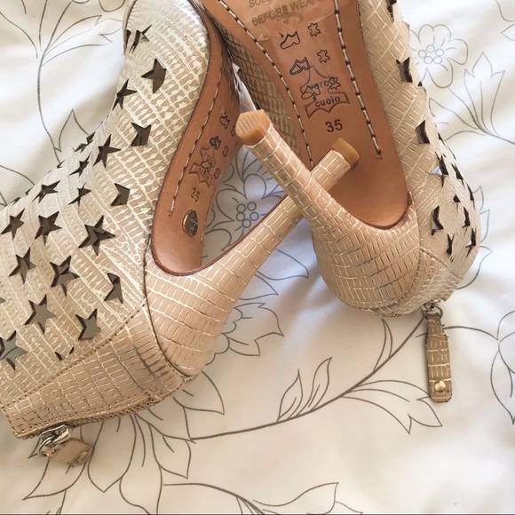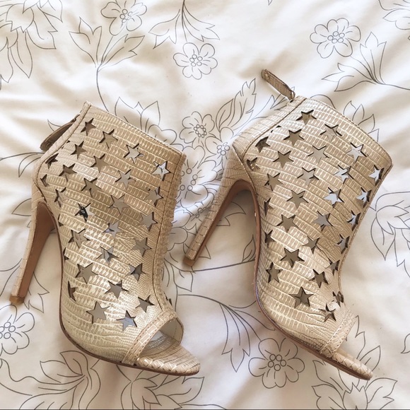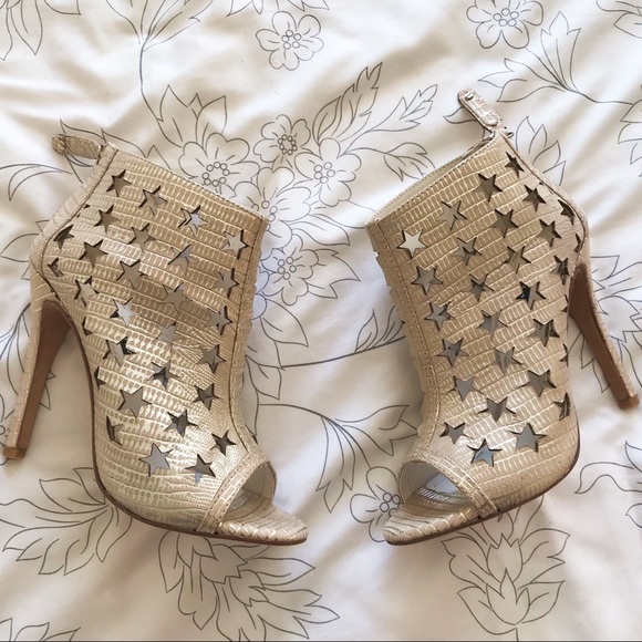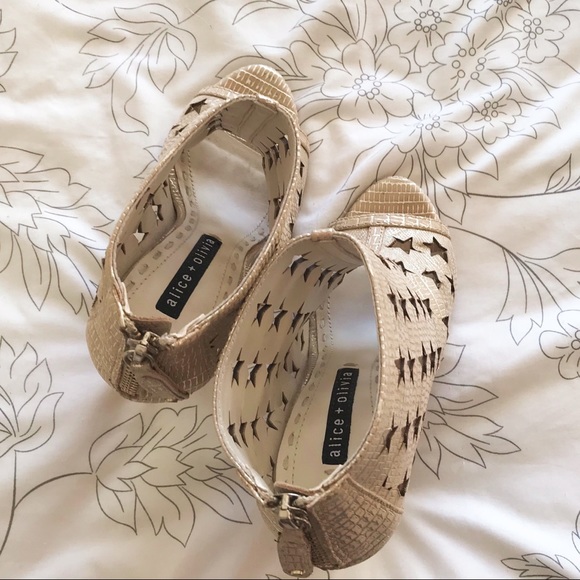 NWOB Alice + Olivia Giovanna star cutout booties- style name: “Giovanna”- marked as a size 35, which is a 5- vero cuoio genuine leather- subtle pale gold with interesting metallic finish throughout- laser cut stars- peep toes- zipper back- approx. 4” tall stiletto heel- new without box, tried on a few times but never wornUnsure if I am ready to let go so fairly firm on price.Tags: star shoes, star booties, celestial booties