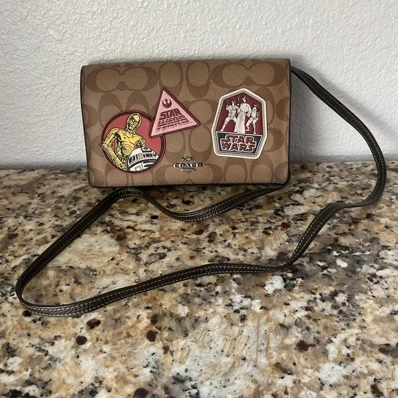 Signature coated canvas and refined pebble leather EUC Eight credit card slotsFull-length bill compartmentInside zip pocketSnap closureOutside slip pocketDetachable strap with 23" drop for shoulder or crossbody wear8" (L) x 4 3/4" (H) x 11/2" (W)• & M Lucasfilm Ltd.Star Wars x CoachIn EUC no major callouts just shown minor signs of wear Please use pictures as part of description, selling as is