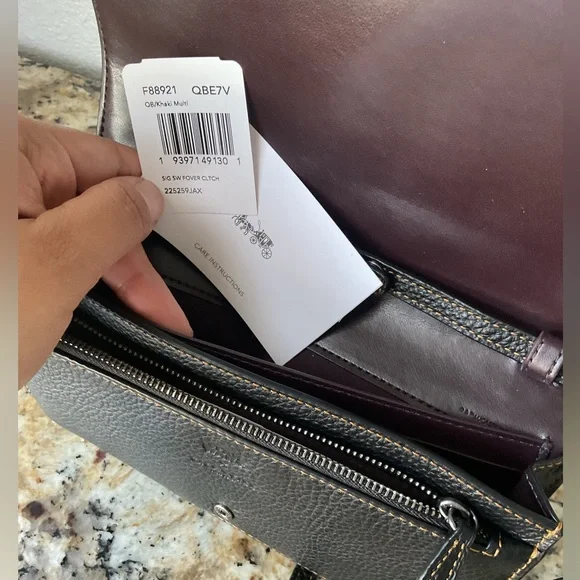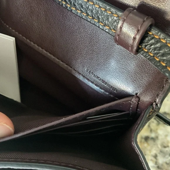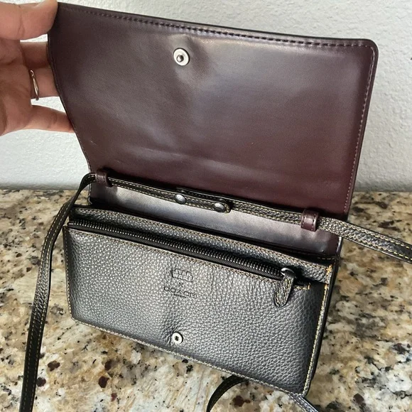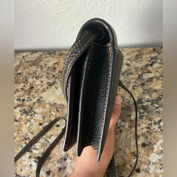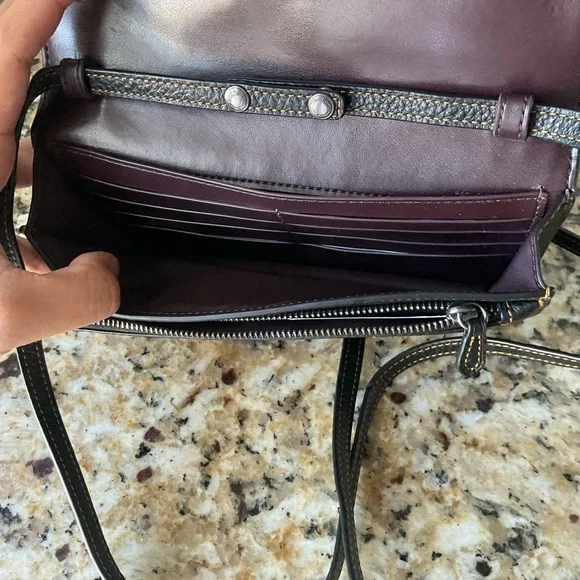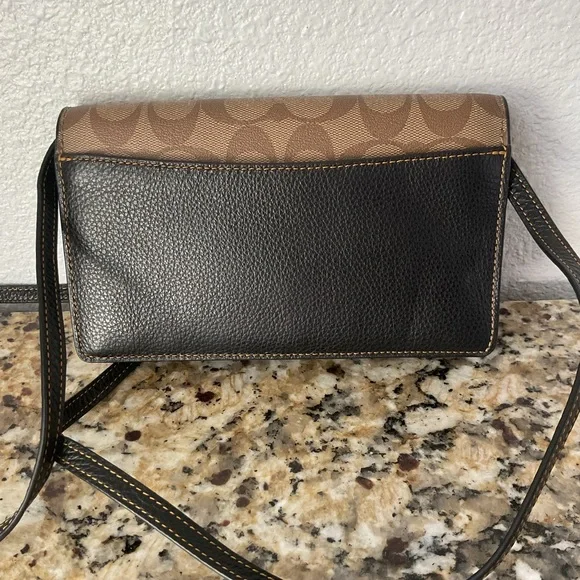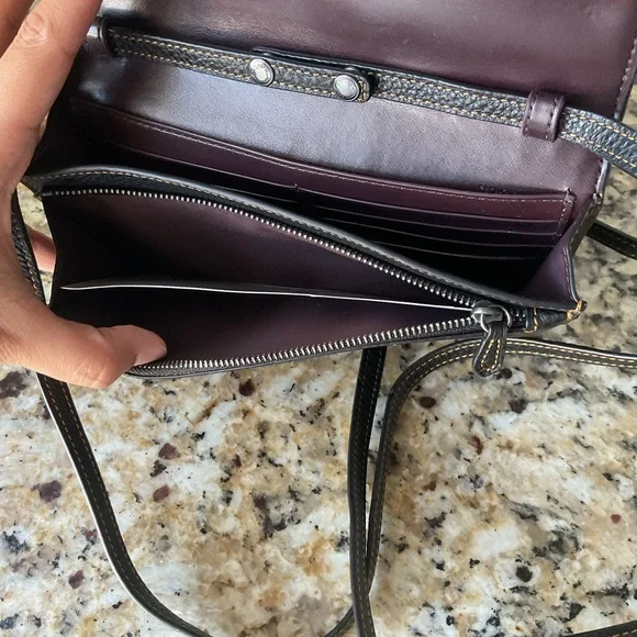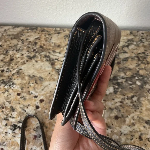 Signature coated canvas and refined pebble leather EUC Eight credit card slotsFull-length bill compartmentInside zip pocketSnap closureOutside slip pocketDetachable strap with 23"...