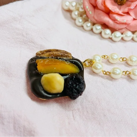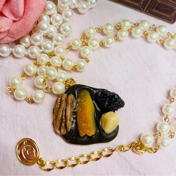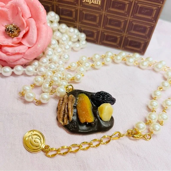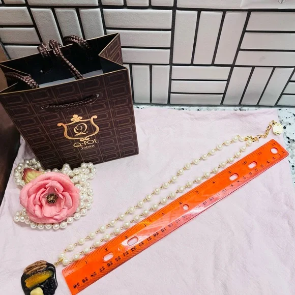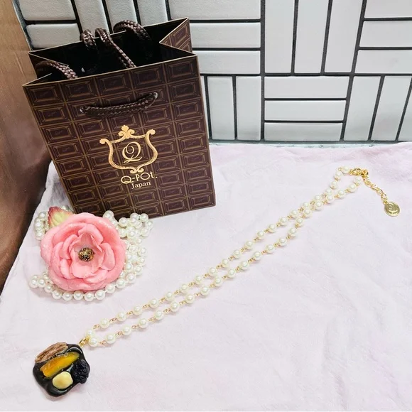 Q-pot. Japan Jewelry Nuts & Raisin Chocolate Necklace (RARE)Condition: pre-owned very good condition on worn twice.Made in Japan Please see size measurements on the listing photos.Purchased in Tokyo Japan.***Q pot chocolate shopping bag is not included in this listing.***RETURN POLICY: All items are final sale.100% authentic buy with confidence.Pink flower & Pearls are not included in this listing.