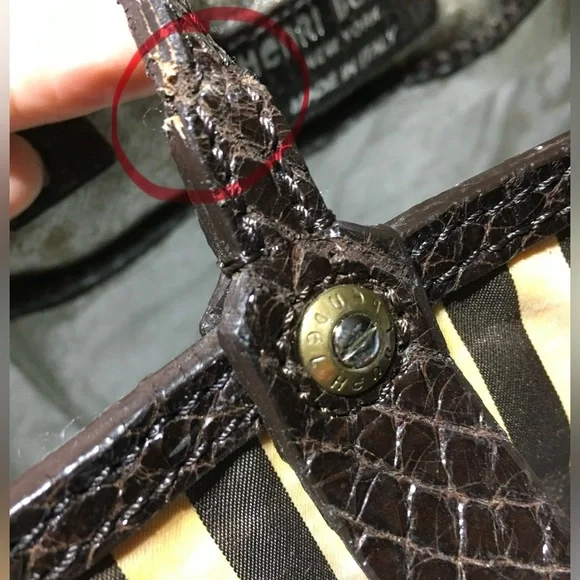 Questions? Leave a comment below!**Please Expand Pics for Closer Inspection ** Extreme Stains Can be Seen on Exterior Canvas Canvas is Also Stiff with Creases or Wrinkles Straps have Cracks (Need Repair) Extreme Wear, Scuffs, Scratches or Marks to Body Corners Edges StrapsGold Tone Hardware - Scratches, Scuffs, WearAlso Some Wear and Marks to InteriorWiped Out But Some Stains Remain