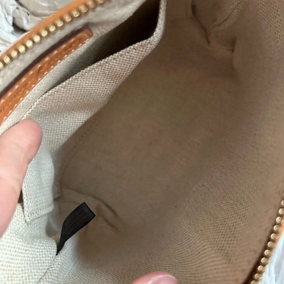 Charming pouch with pink and blue floral design. Features tan leather accents. Perfect for organizing essentials.