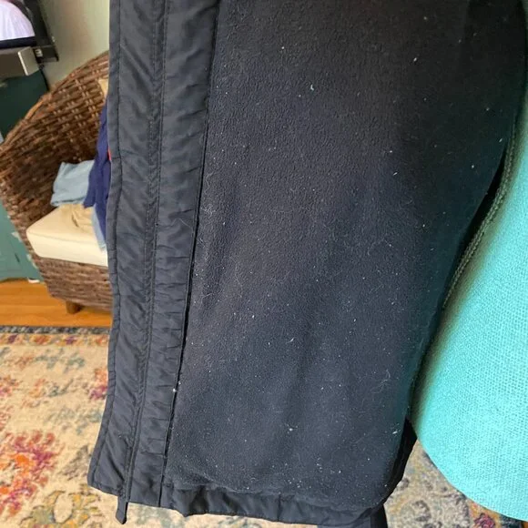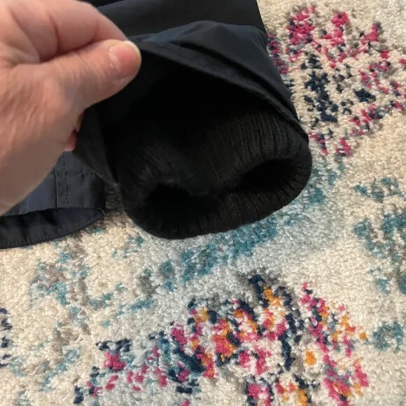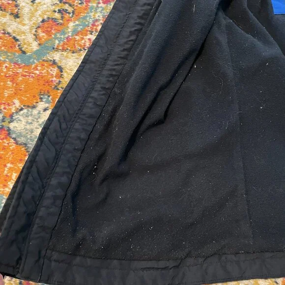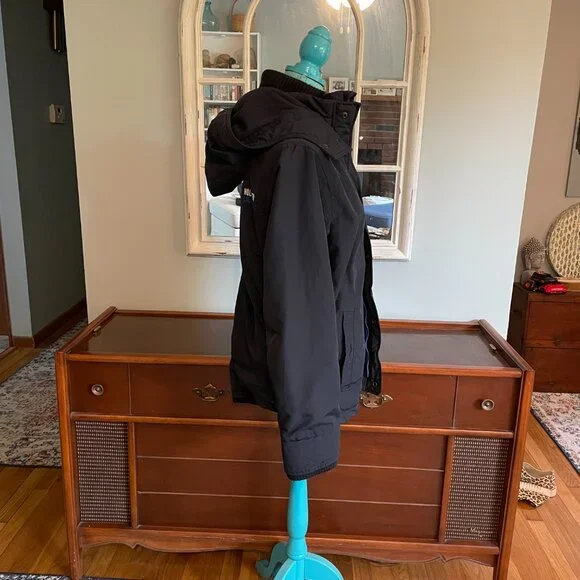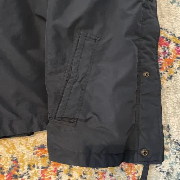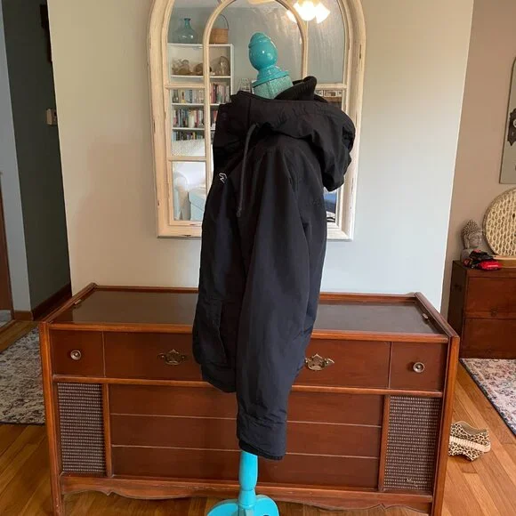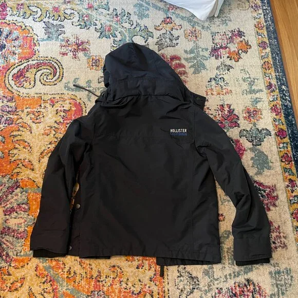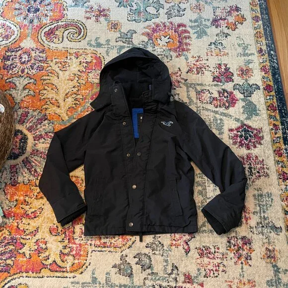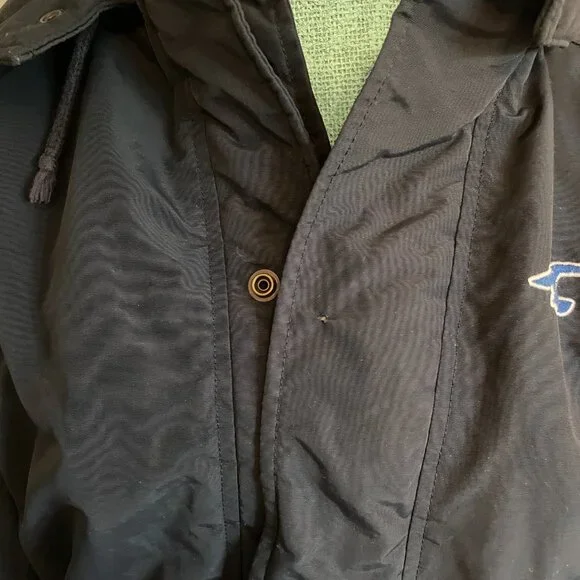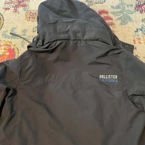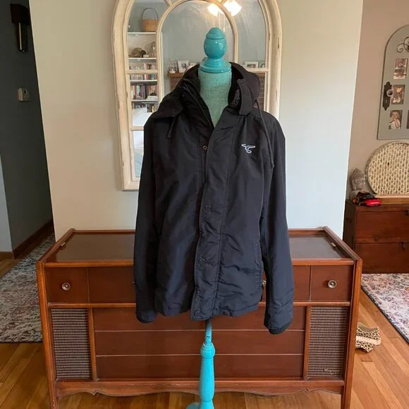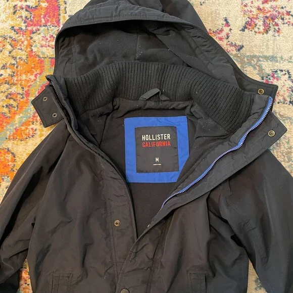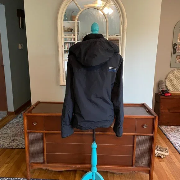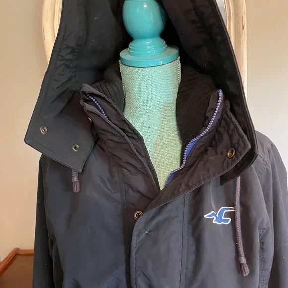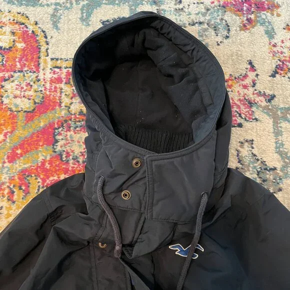 This is an awesome Hollister winter hooded jacket. It is missing the top outer snap piece on the front of the jacket. The rest of the jacket has no flaws. No rips, holes, stains etc.Water resistant outer shell, light fleece interior. Not super heavy. 2 outer slash pockets, interior arm cuff. Front has both zipper and snaps. Nice high neck with hood with snaps and drawstrings.Navy blue with navy blue light fleece interior. Interior does show some pilling.Blue seagull applique on the left front chest area. Young mens M. This was purchased somewhere between 2010-2015.Measurements- armpit to armpit 22"/overall 27"/armpit to cuff 21"Great jacket winter.