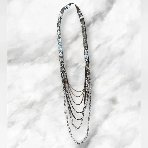 This designer showed off a punk rock side with this gorgeous mixed metal chain piece. A metallic sequin strap takes the place of any clasp, so you can just slip it on and go. The brand marking is sewn in as shown in the photo. This is in excellent condition, possibly never worn. No flaws. This designer piece will be sure to get you compliments.