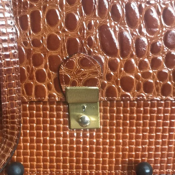 Beautiful vintage Attaché case style purse, possibly made of Crocodile leather , but certainly leather. Stain on front corner ( see photos) . Measure 12” across, height 7.5”,depth 2.25. Detachable strap measures about 50” including gold tone hardware. All sales final . Unbranded but rare includes key for lock. Look’s unused