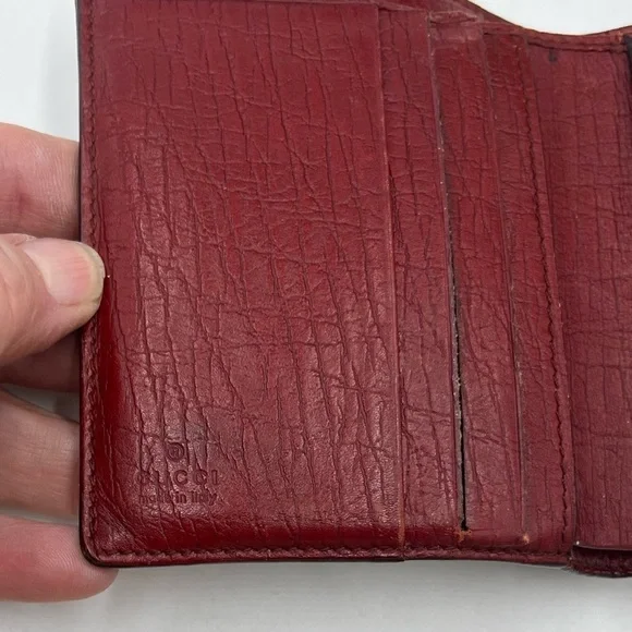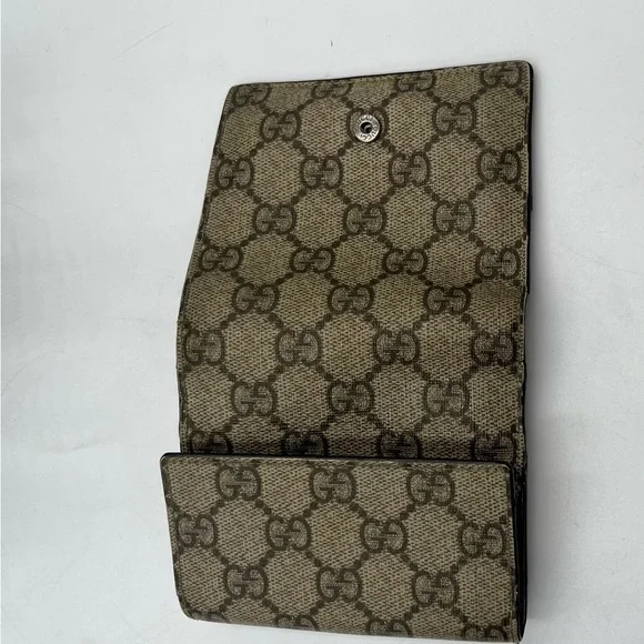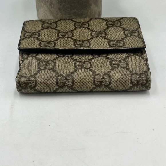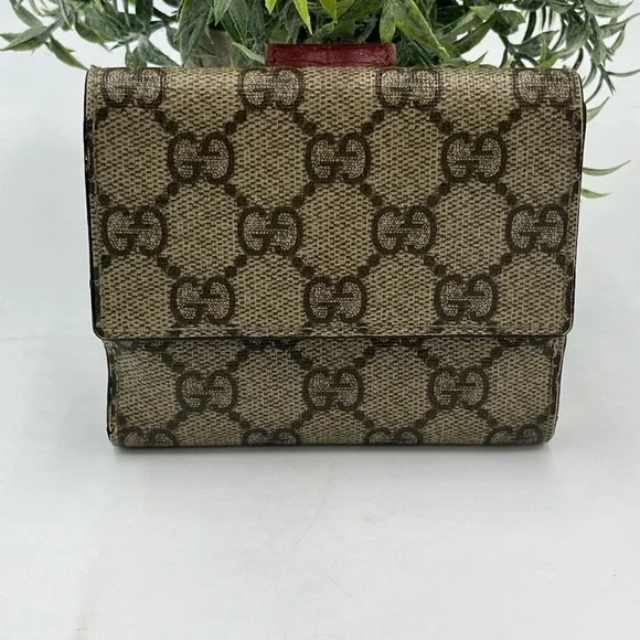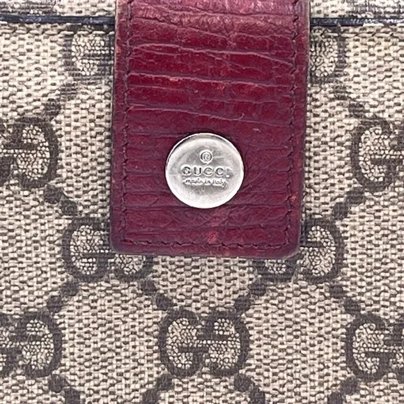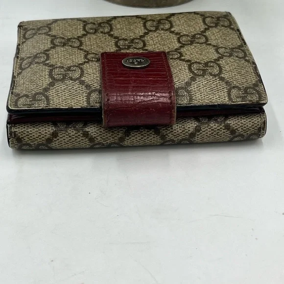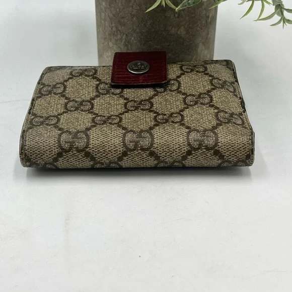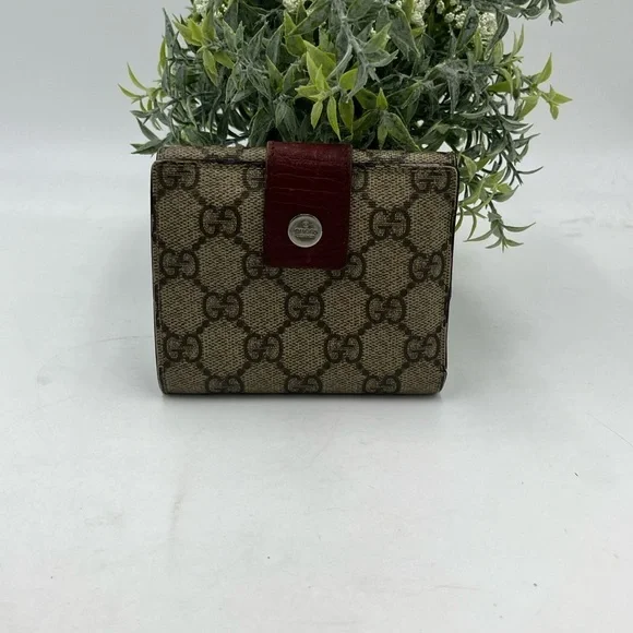 Brown GG Monogram Canvas with Maroon leather trimming. Wallet Purse Folding wallet GG Plus Beige Brown Woman AuthenticCondition Notes:some signs of cosmetic wearEst. Retail: $780size....4.5 x4" approx.- 6 card slots- 2 utility compartments-1 snap-closure compartment- 1 bill compartment- White leather lining- Classic GG Supreme- Snap closureSome white discoloration inside bill compartment One card slot is torn making the fabric go into two pockets Wear on front metal snapOverall good condition for its vintage age