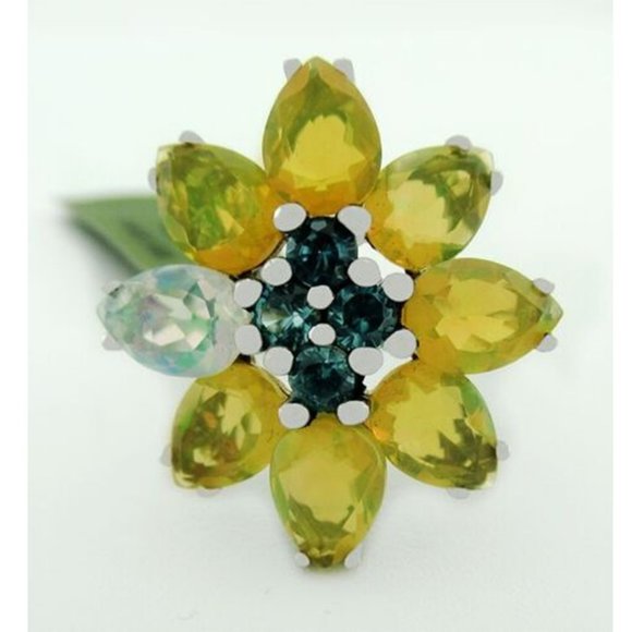 Karat: .925 sterling silverGemstone: 8 Genuine Opals - 0.50 ct eachTotal ct weight : 4 carats Opal grades,Hue . . . white-multiTone . . . medium darkSaturation . . . vividCut . . . very goodNo inclusions or flaws4 Genuine blue zircon - 0.10 ct eachTotal ct weight : 0.40 caratsBlue zircon grades,Hue . . . greenish/blueTone . . . medium darkSaturation . . . vividCut . . .very goodNo inclusions or flawsShape : pear & roundSize: # 8Net Weight:4.9 gramsSetting : prongDimensions: 20 mm diameter - setting measurements