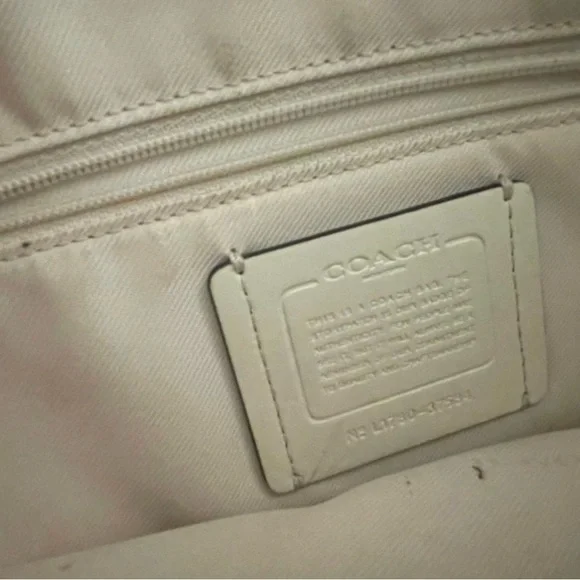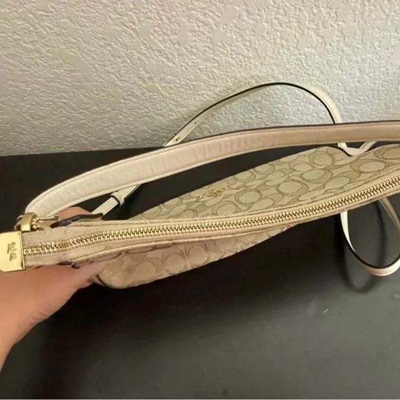 Coach Beige Signature Canvas and Leather Shoulder BagAuthentic. Fair condition Handles with 7 3/4" dropStrap with 22" drop for shoulder or crossbody wear11 1/4" (L) x 7 1/2" (H) x 3 1/4" (W) (width is measured across the bottom of handbag)