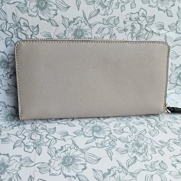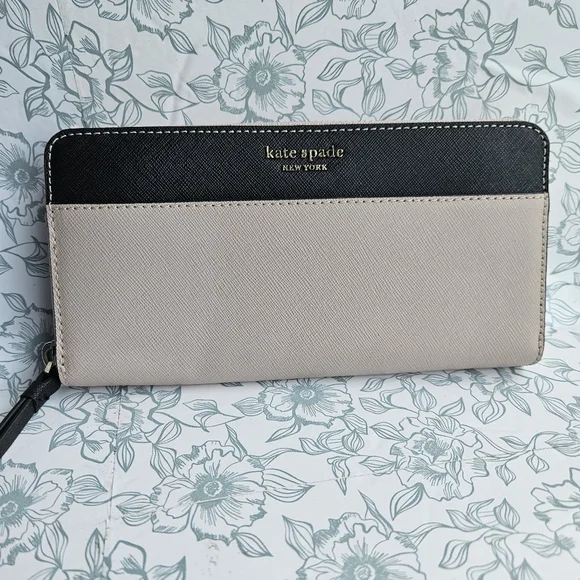 Kate Spade Cameron Large Continental WalletMaterial: LeatherColor: Warm Beige and BlackA classic grained leather crafted wallet that features zip-around closure and ample card slots, zip compartments, and slip compartments.- large continental wallet with exterior slide pocket- zipper coin pocket- 12 credit card slots- 3.9"h x 7.7"w x .8"d
