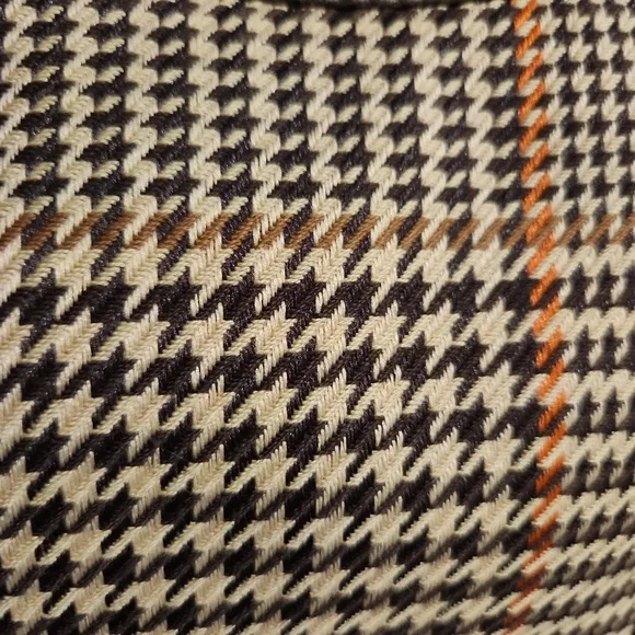 Cute little brown houndstooth bag. NEW WITH TAGSHoundstooth cotton body with brown leather strap, trim, bottom, and cornersVisible stitchingGoldtone hardware Zipper closure with a leather pullLeather strap with a 9-inch dropLight tan polyester brand lining interior One zipper pocket with leather trimGoldtone horseshoe shape bag charm on a leather strapThe Houndstooth cotton material features vertical a d horizontal running stiched Houndstooth in orange, dark brown, cream, and olive. VERY HORSE AND HOUND!