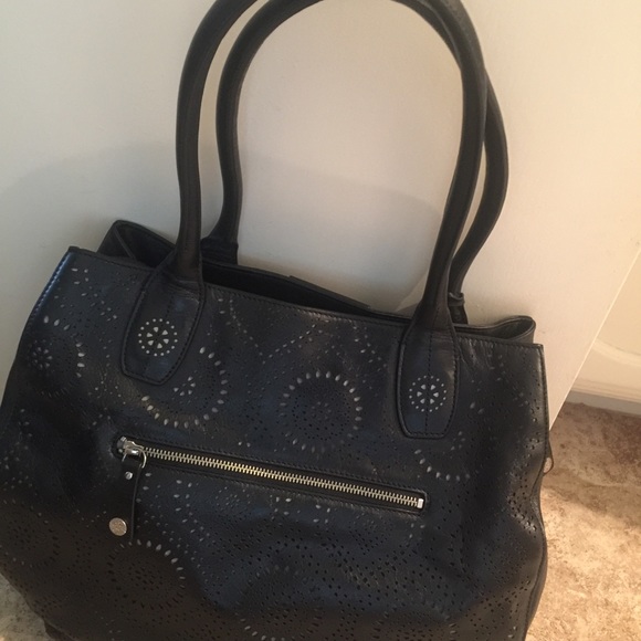 "Petunia" brand Black laser cut leather tote. Purchased for travel but never used. NWT