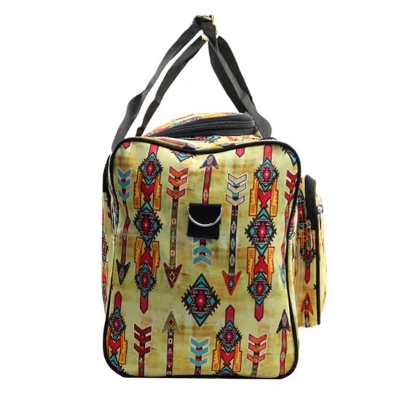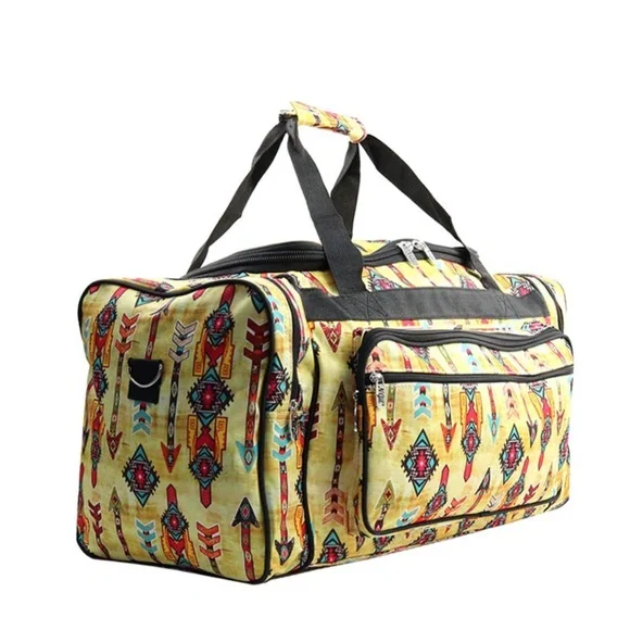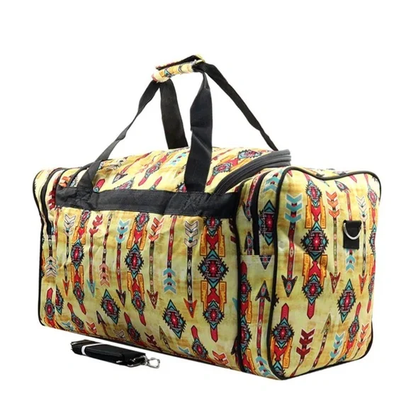 This canvas duffel bag by Fleurish Jewelry is the ultimate travel companion. Measuring 20 inches in length, it provides ample room for all your essentials, while its sleek black color and tribal arrow design add a touch of style. Made from durable canvas, this bag is built to withstand everyday wear and tear. Its unisex design makes it a versatile choice for any traveler, whether you’re on a business trip or vacation. Featuring a top zipper, front and back zipper pockets, and additional pockets on each end, this bag offers both convenience and functionality. The double carry handle with Velcro and adjustable shoulder strap ensure comfort while on the go. Ready for monogramming, it’s a personalized option too. Add this stylish, functional duffel bag to your travel gear today!•Dimensions: 20” L x 10” D x 12” H•Zipper top closure•Multiple zipper pockets•Double carry handle with Velcro•Adjustable shoulder strap•Monogram-ready•Trademarked design