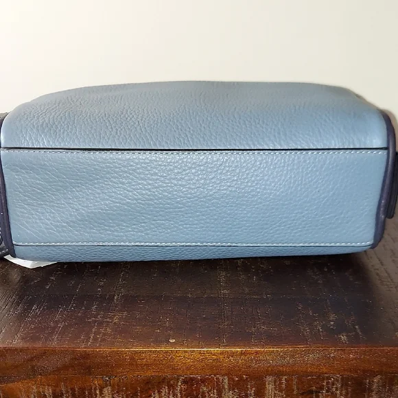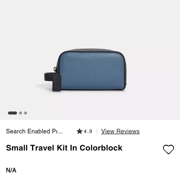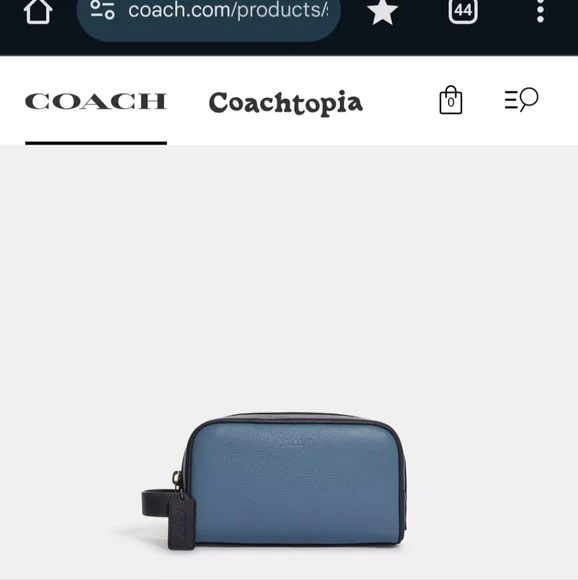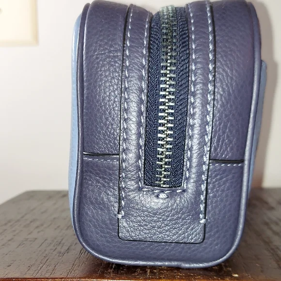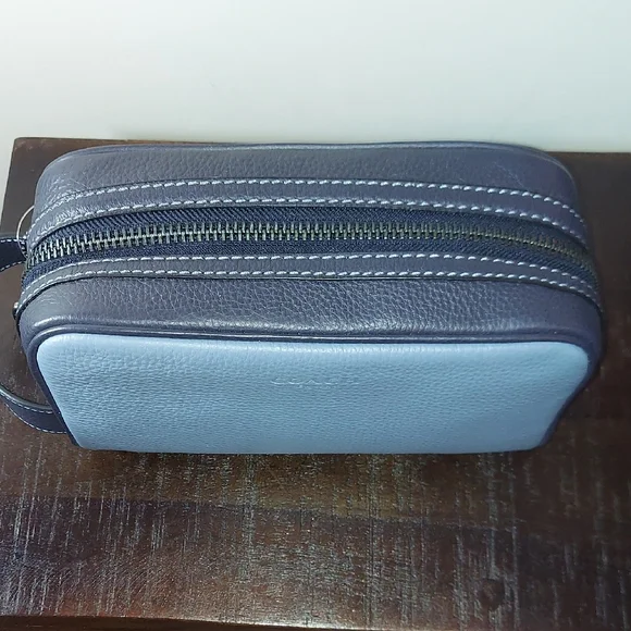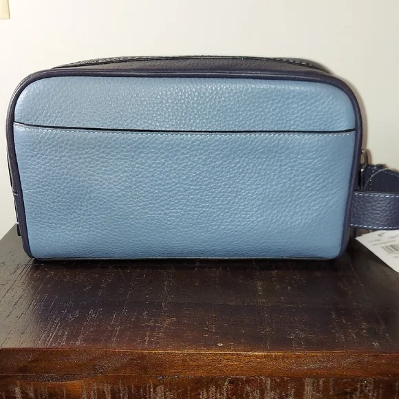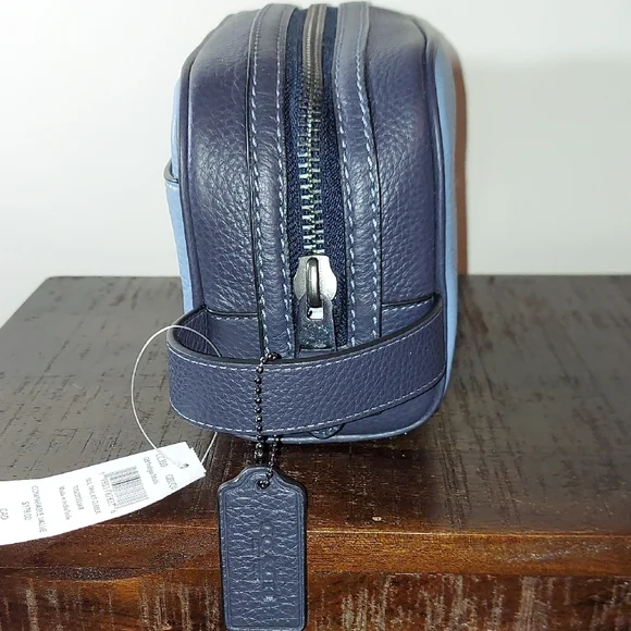 Brand: CoachModel: Small Travel Kit Style No: CC350Color: Colorblock Blue Indigo Material: Refined Pebble LeatherInside Slit PocketOutside Slit PocketZip ClosureBlack Fabric LiningSide Handle 1.75 " DropMeasurements: 8.75"L x 5"H x 3.25"DMeasurements are approximate Great Gift#travel #toiletries #essentials #dopp #everyday #makeup #organizer #art #supplies #gift #hair #jewelry #shaving #work #holiday #school #designer #coach #christmas #valentines #birthday #anniversary #graduation #congratulations@crystalmoving