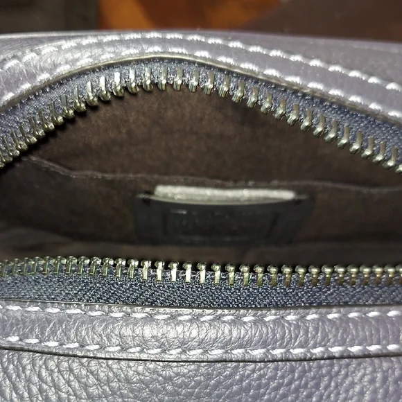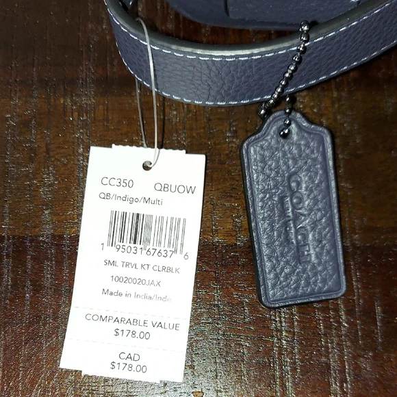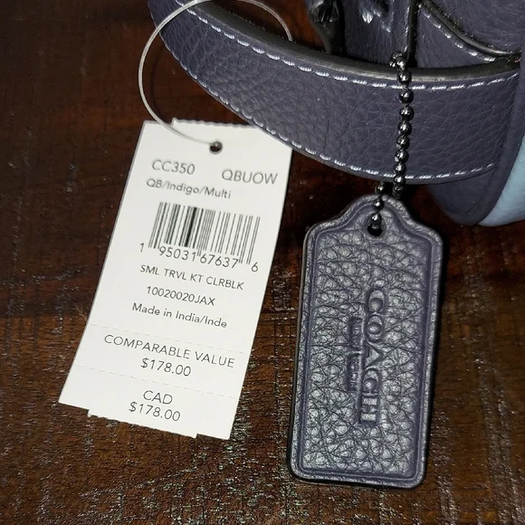 Brand: CoachModel: Small Travel Kit Style No: CC350Color: Colorblock Blue Indigo Material: Refined Pebble LeatherInside Slit PocketOutside Slit PocketZip ClosureBlack Fabric...