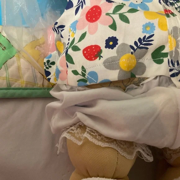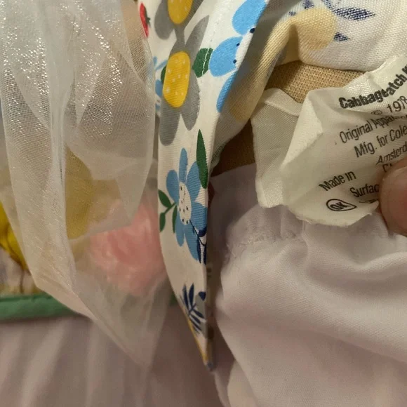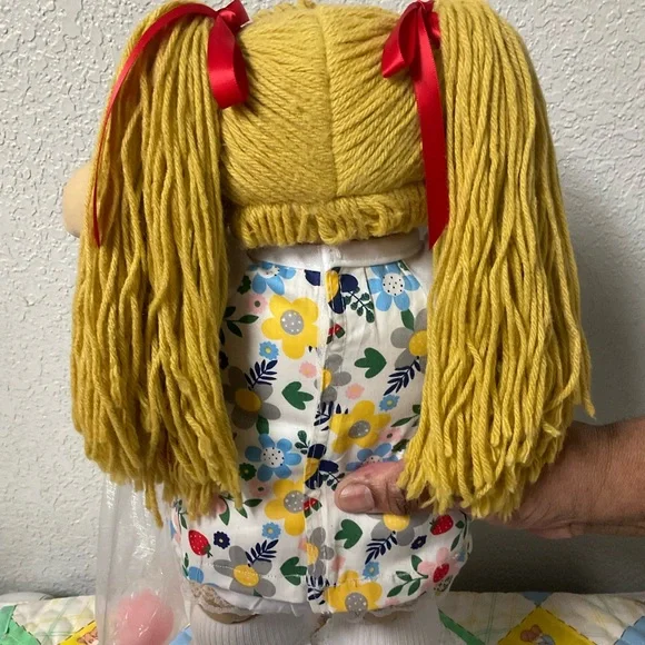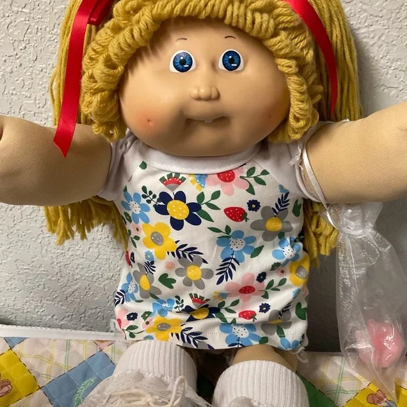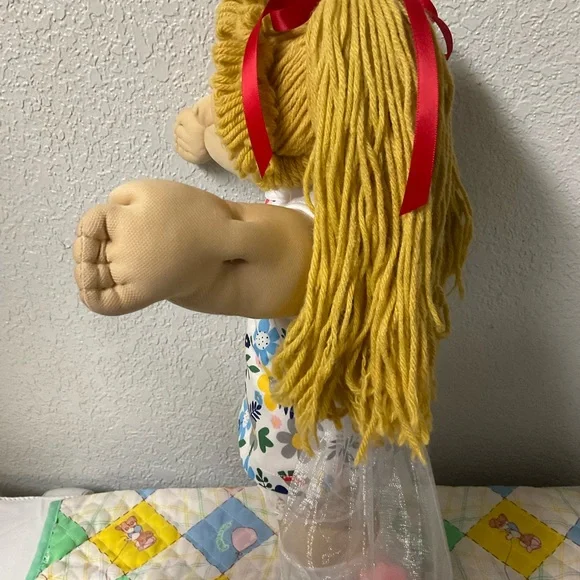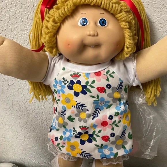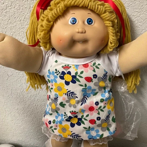 This cutie has long butterscotch double ponies and pretty blue eyes. She is from the OK Factory and she has a blue 1985 signature. She is wearing a BRAND NEW dress and BRAND NEW handmade bloomers made by a talented seamstress. She is also wearing a NEW diaper, pretty lace socks, and CPK shoes. She is FULLY DRESSED and doesn’t need anything to be bought for her unless that’s your desire. She is in very good vintage condition for her age of exactly 40 but please bear in mind that she is still a vintage item-not new and therefore not perfect. Please see all pics as they are part of the description. She comes from my smoke free home although I am not her original owner. Sold AS IS.She comes with custom made adoption papers just for fun……. I call her Arden Soraya but please feel free to give her the name of your choice. She also comes with a little gift.PLEASE NOTE: Most of the items I sale are almost 40 years old so please know they will not be perfect. I do my best to describe them as accurately as I can. Please also take note of the pictures as they are part of the description.