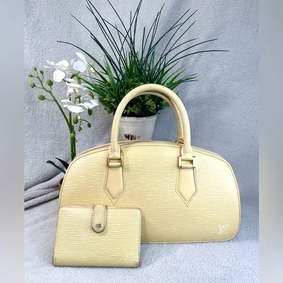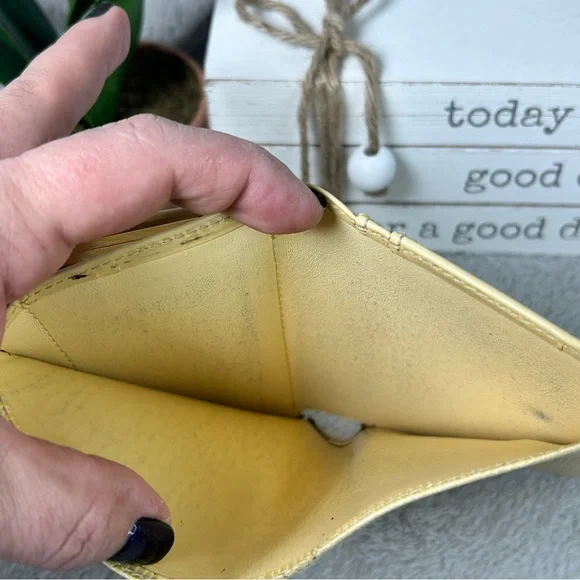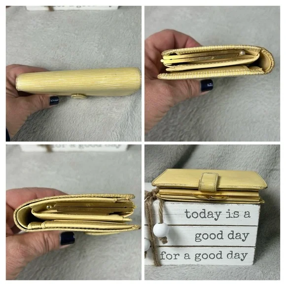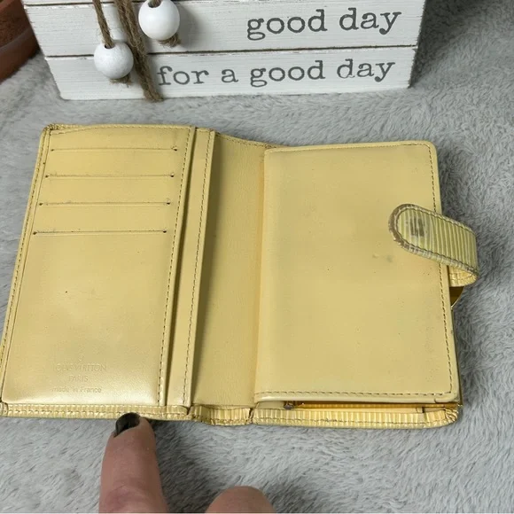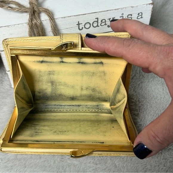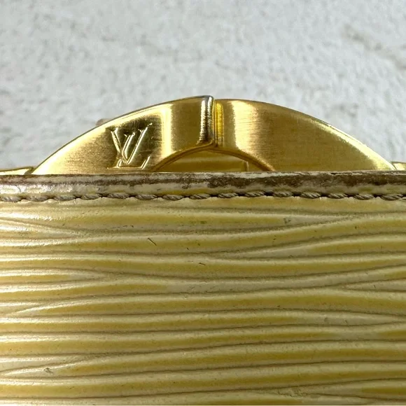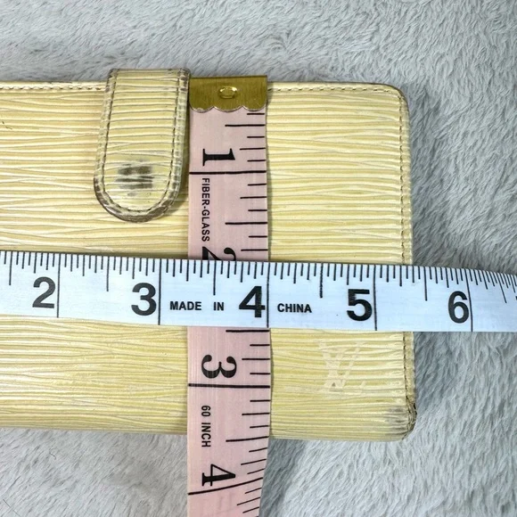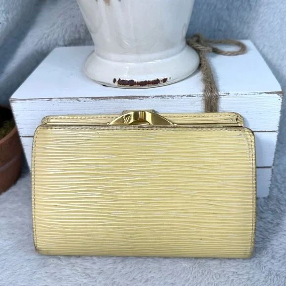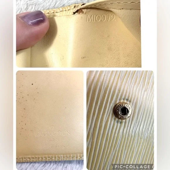 Beautiful cream (I like to think of it as butter) color Epi leather, this girl shows some wear from her 21 years of living but is structurally sound. Four card slots, bill slip, kisslock coin pouch. Discoloration is worst of the wear, with tinnnny separation right where the date stamp is.Thinks of itself as part of a bonded pair with the purse but can go separately. Deeper discount if bought together. Purse in separate listing.Best photo of the color of the wallet is actually the last where it’s with its mate.
