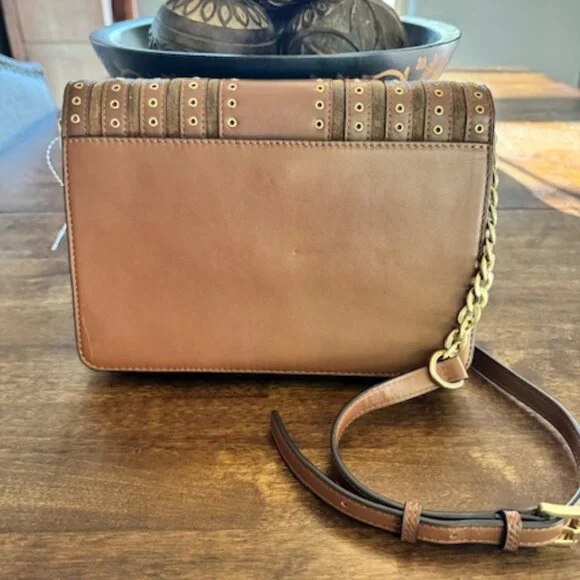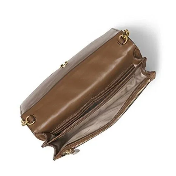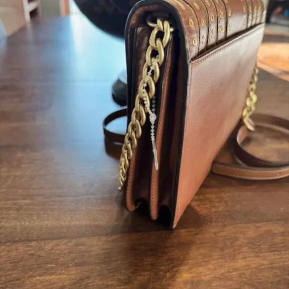 Color: Dark CaramelAdjustable chain and leather crossbody strap with 22-25" drop*Gold tone hardware *Flap top closure with snapExterior: back snap slip pocket *Interior features:...