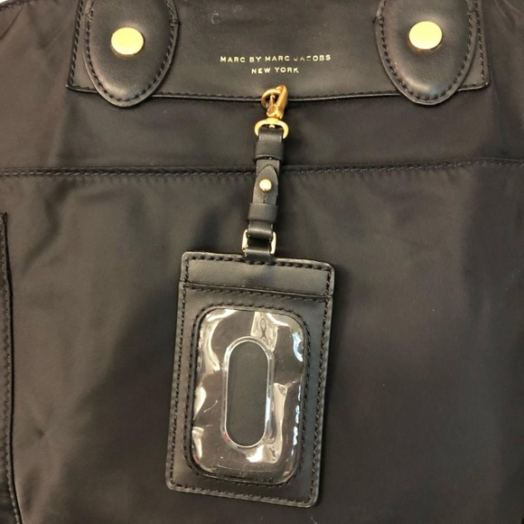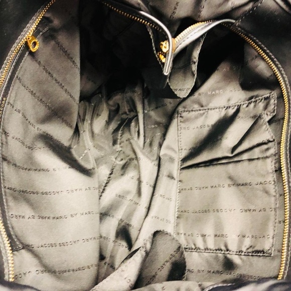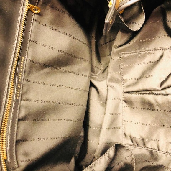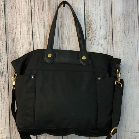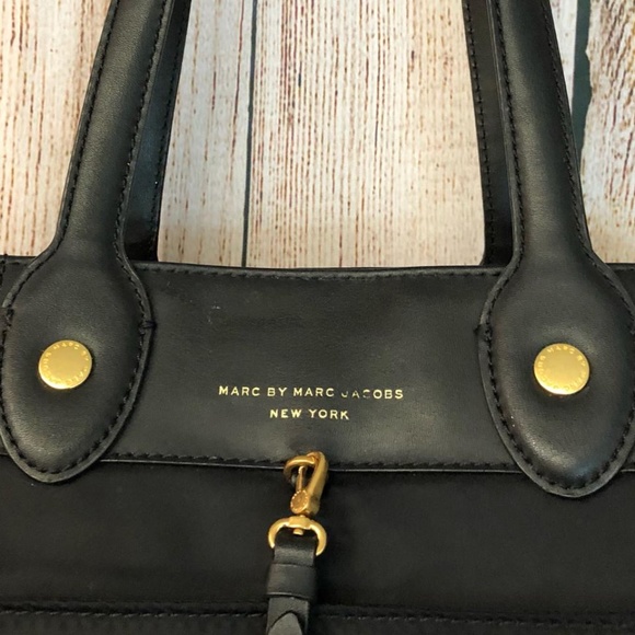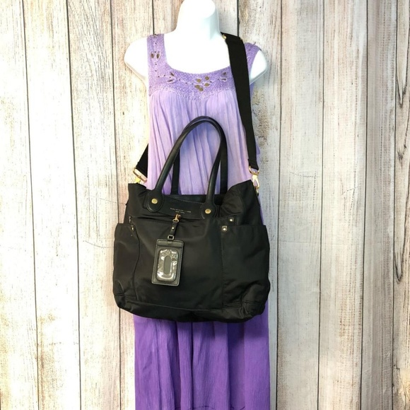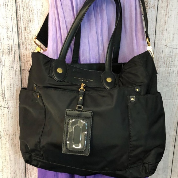 MARC BY MARC JACOBS LEATHER TRIM BLACK NYLON TOTE CROSS BODY BAGBlack nylon Marc by Marc Jacobs tote with leather trim, gold tone hardware, wide removable grosgrain shoulder strap, patch exterior side pockets, tonal stitching detail, top zip closure, black jacquard nylon lining, zip and slip pockets on the interior wall.Strap drop 8.5" /23"L 19" x W 7.5" x H 13"Light scratches on the leather and hardware. Good condition. Check the photos pls.