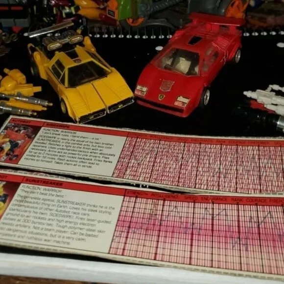 If were talking classic duos in Tranaformers, then Sideswipe and Sunstreaker, the twins are first in the list. Both are complete with File Card,and firm decals. Collections of Ninja Turtles, Star Wars, GI Joe, Transformers and more so check out our page. Bundle for savings on shipping