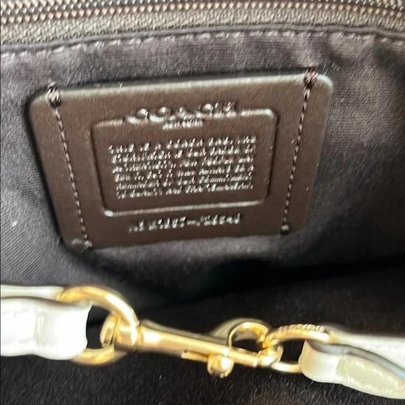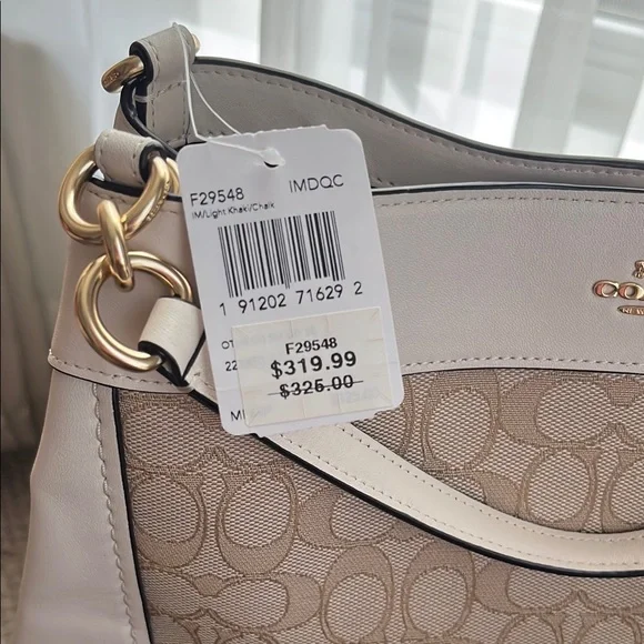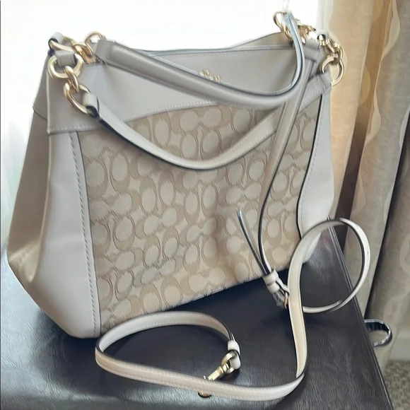Elegant Coach Lexy Signature Leather Bag in Khaki/chalk/gold with a magnetic buckle and can be worn in any occasion (business,casual, party)