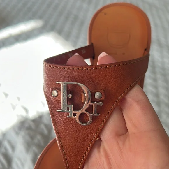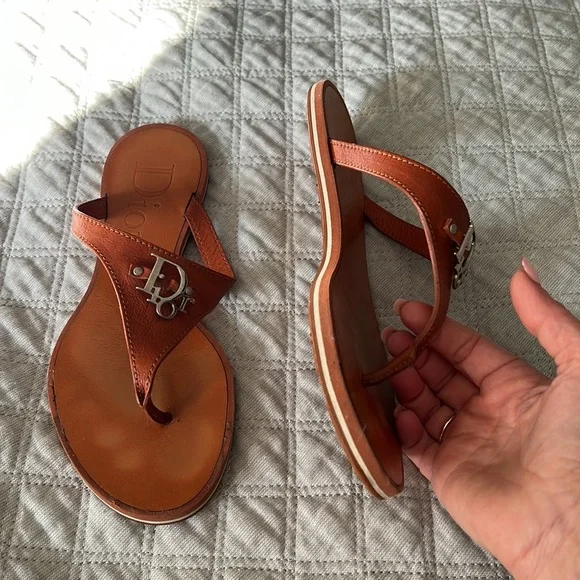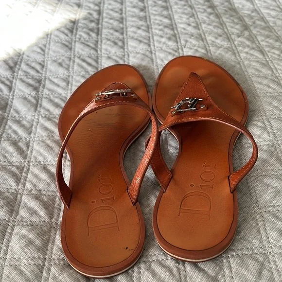 Dior Authentic Brown leathersandals in very good condition. Has a silver Dior metal logo on the top.Size 36Or USA 7 . Leather inside and rubber on the sole of the sandals . Wore them few times it was little lose on me so I didn’t were them that much . Soft leather very clean. Comes with box