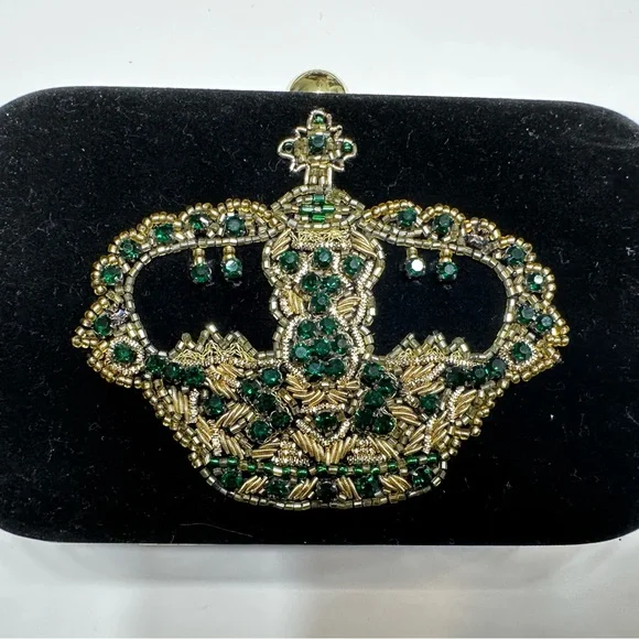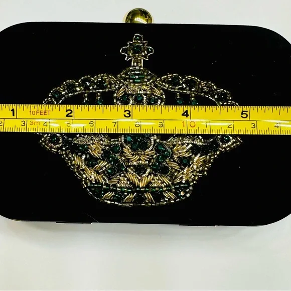 This luxurious black clutch showcases an ornate golden & emerald beaded crown design making it a standout accessory for any elegant occasion. The plush black velvet material and...