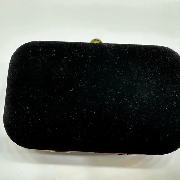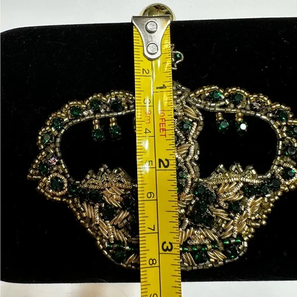 This luxurious black clutch showcases an ornate golden & emerald beaded crown design making it a standout accessory for any elegant occasion. The plush black velvet material and intricate detailing exude sophistication and opulence. Designer Dust Bag and removable shoulder chain strap are included.
