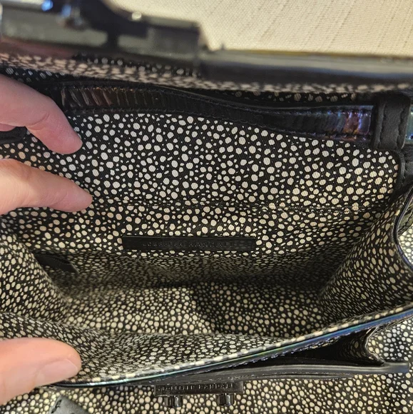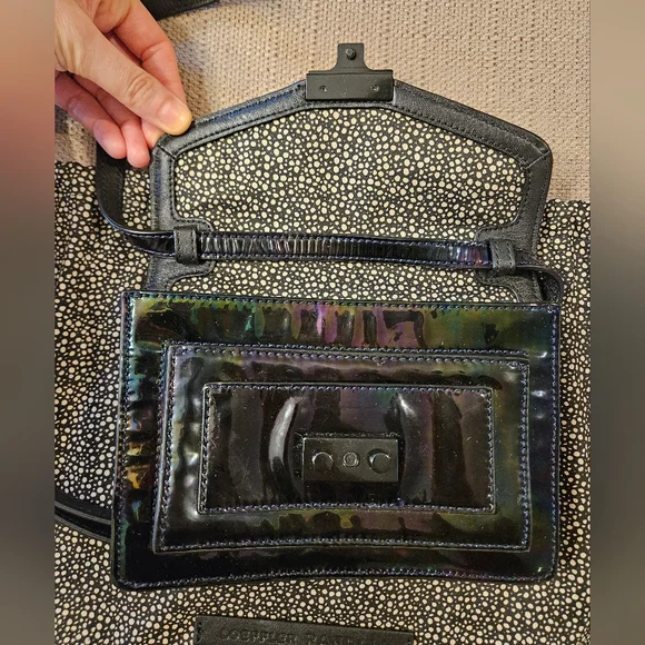 This bag gives major Henri Bendel petrol or Tieks Arabian Night vibes!Bag is in great condition with clean interior.Iridescent patent leather Loeffler Randall Rider bag with black coated hardware, flat top handle, single detachable shoulder strap, single slit pocket at back, dual slit pockets at under flap, black and creme print canvas lining and push-lock closure at front flap. Includes dust bag. Shoulder Strap Drop: 23"Handle Drop: 1"Height: 6"Width: 8"Depth: 2.5"