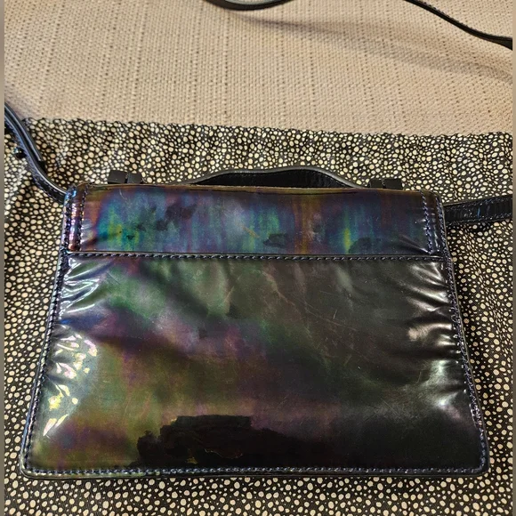 This bag gives major Henri Bendel petrol or Tieks Arabian Night vibes!Bag is in great condition with clean interior.Iridescent patent leather Loeffler Randall Rider bag with black...