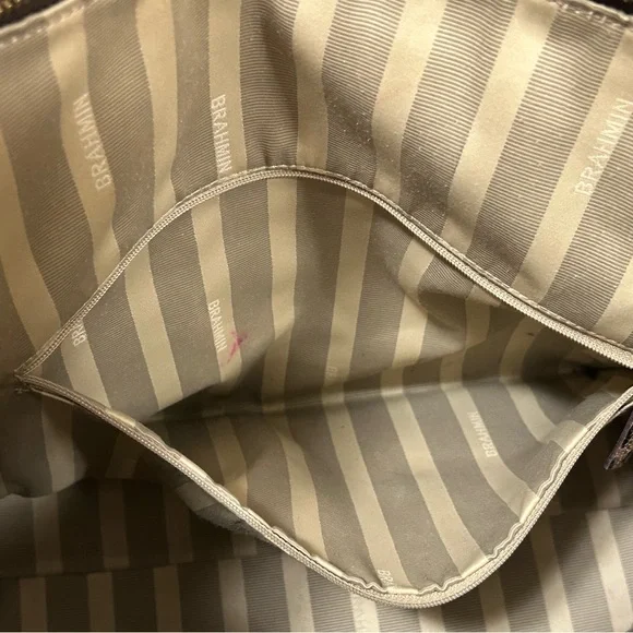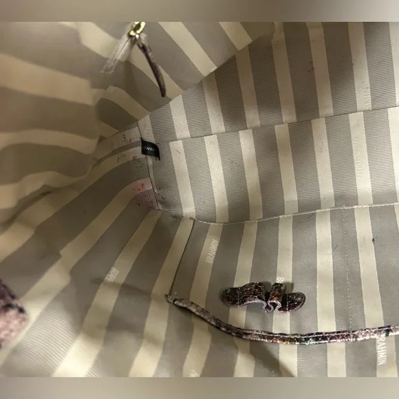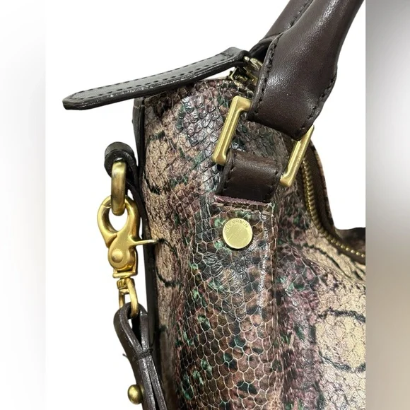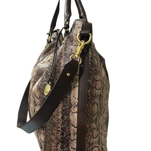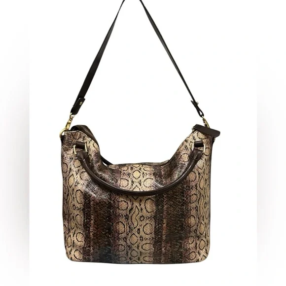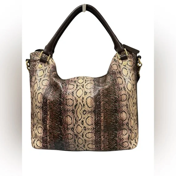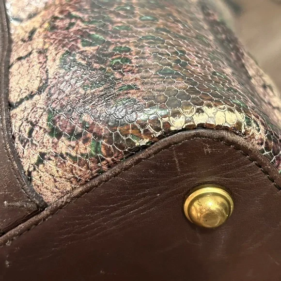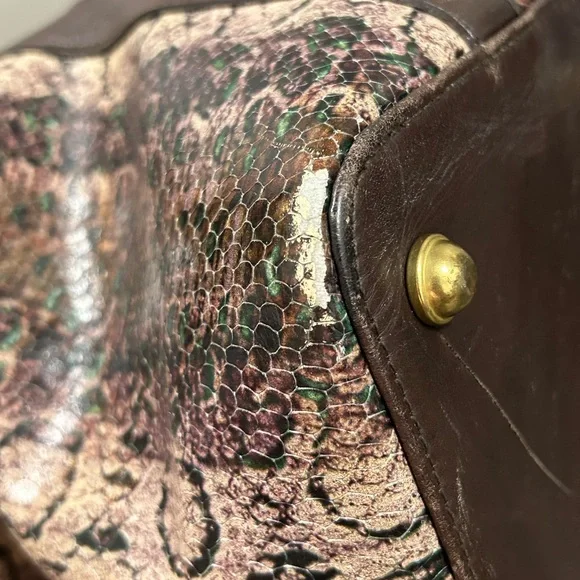 A gorgeous bag - and a rare find!The snakeskin textured hobo bag comes to you in Violet Cusco,, and it’s just so fun! It’s primarily brown, with use of purple and green. The hardware is gold colored. It can be carried as a satchel or as a shoulder bag with the extra strap. It does have very minimal exterior, primarily tiny mark on the outside, and two scuffed bottom corners, as you can see. Estate item. Thank you for looking! It measures approximately 15.5 inches long by 12 inches tall, with a 10 inch strap drop from the longer shoulder strap.