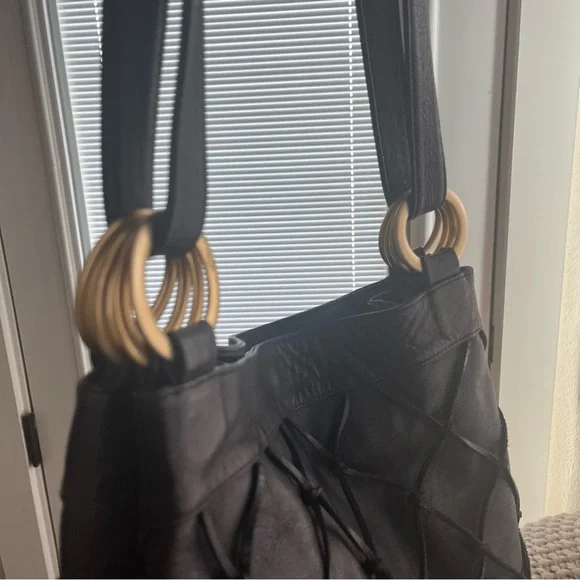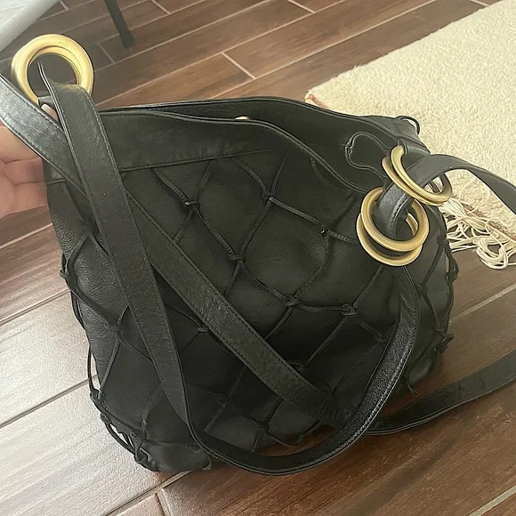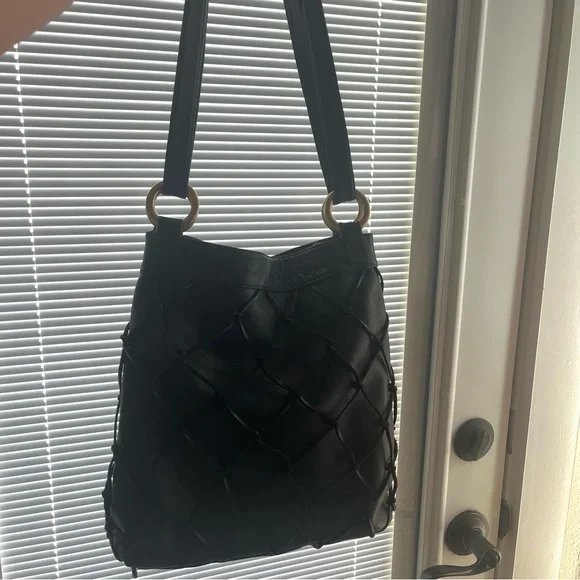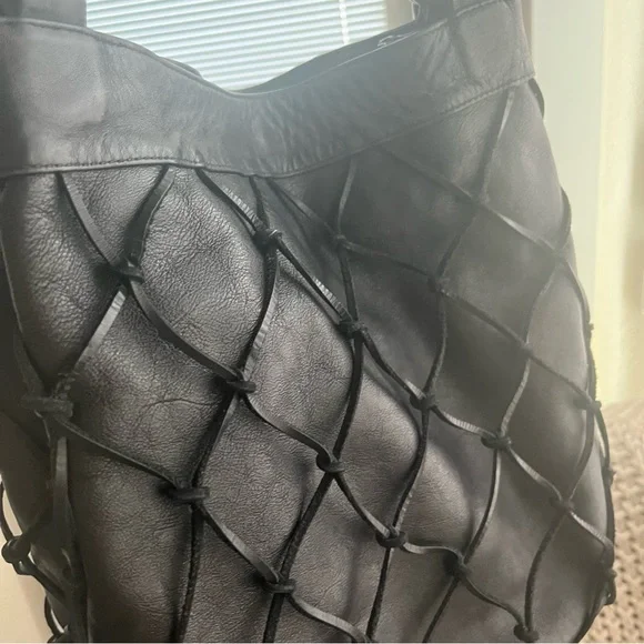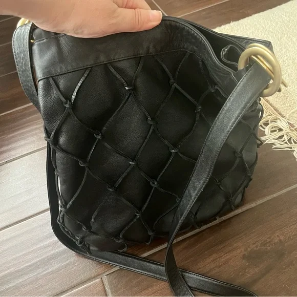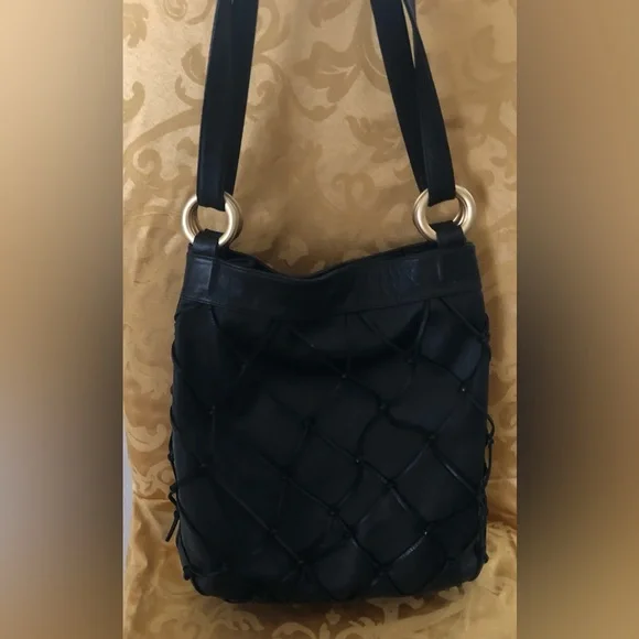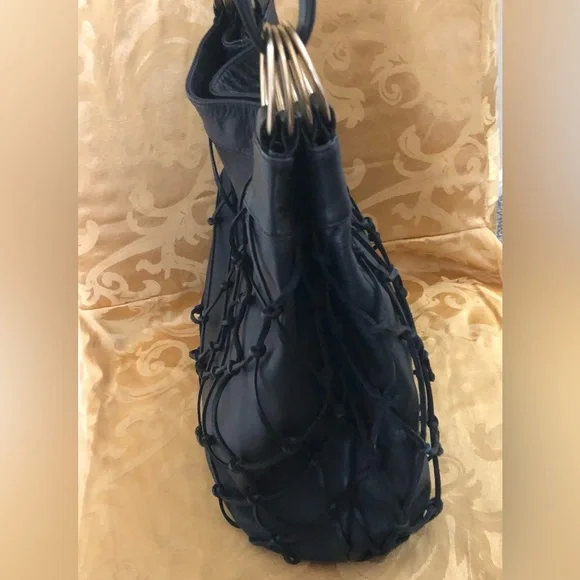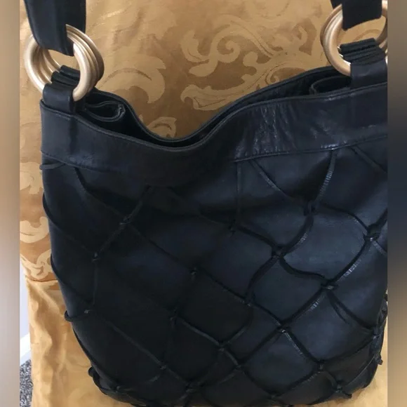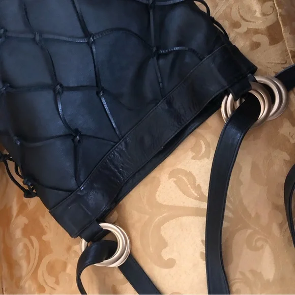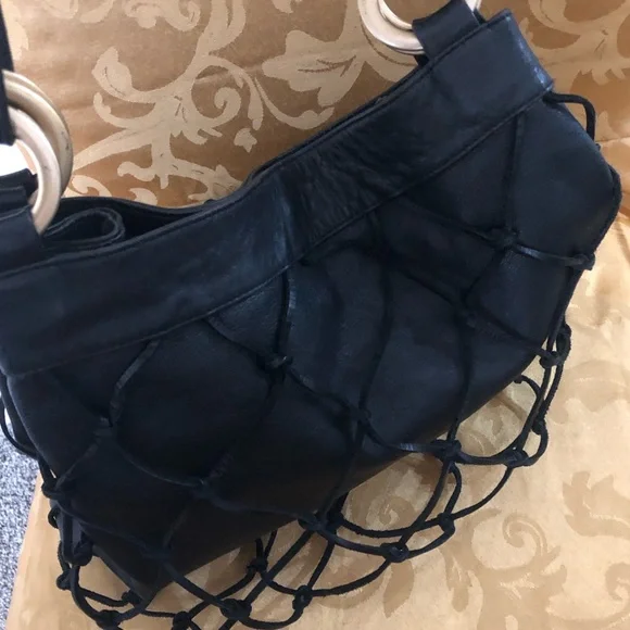 Large Black soft genuine leather shoulder bag Macramé leather netting layerLinedMade in ItalyPreowned conditionGold hardwareBag fashion trend !All my items are photographed before shipping!